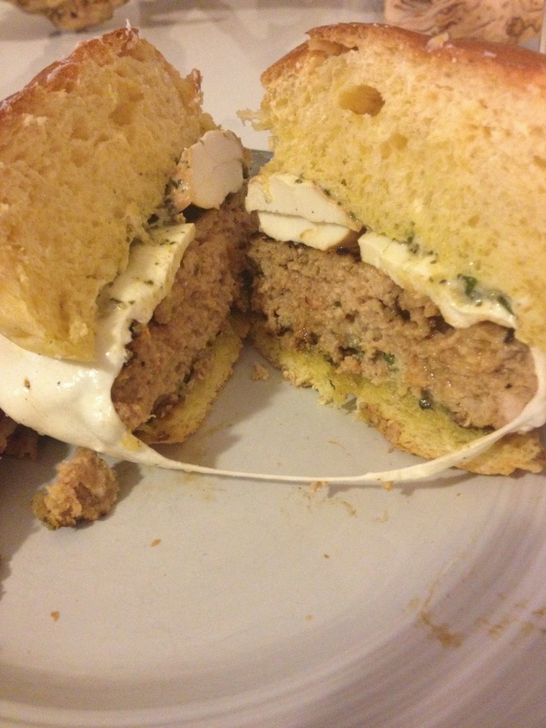 There are a couple ways to do this, you can mix the pesto right into the turkey meat or if your turkey burger was already pre-shaped at the butcher counter like mine was, you can do what I did and just use the pesto as a spread right on the bun. You can do this plain or, again, follow my lead and mix it with mayo to give the spread a little extra creaminess. I like the pesto/mayo ratio to tip in the pesto’s favor, but that’s just me. For the final touch, top with smoked mozzarella. For best results, put the mozz on top of the burger as it finishes cooking in the pan or on the grill. Then cover it with the lid of a pan so the steam gets the cheese nice and melty. That’s how you get the gorgeous stringy cheese you see in the pic.