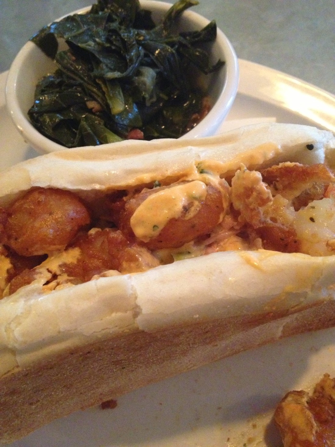 5 Spot feels like a cross between a cafe and a regular restaurant. To me that means it has the low key, neighborhood-y, artsy-ish feel of a café but with a more substantial menu. There is definitely something for everyone here. In addition to the large plates, the menu has 14 sandwiches, 8 burgers, 5 quesadillas, and 6 salads to choose from. Almost all of these items are under $10 and come with a side. I ordered the po boy with fried shirmp and spicy slaw along with a side of collards. The sandwich was huge and the shrimp were not overbattered. The collards had such a great smoky flavor, like they were sitting on the smoker while bbq was being prepared.
