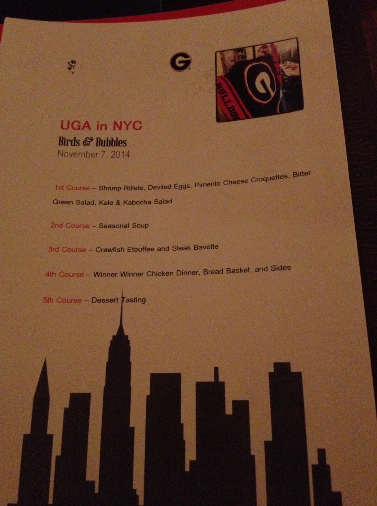 On Friday I was invited to a dinner with some fellow NYC Dawgs and members of the Alumni Association. We went to Birds & Bubbles as the chef and owner is a UGA grad and former NYC Dawgs prez. Before she stepped down to focus more on being the absurdly talented New York chef she is, she helped get me involved in the organization. For that, I thank her. But I think I thank her more for her fried chicken and champagne, for that is truly a service to all of New York City.