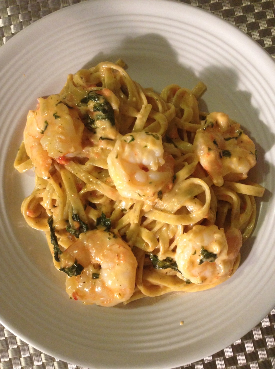 The sauce all comes together in one pan, as long as you have a stick blender. I wanted a little protein so I added shrimp. After puréeing the sauce I turned the heat back to medium-low and gently laid the shrimp down to simmer for about two minutes per side.