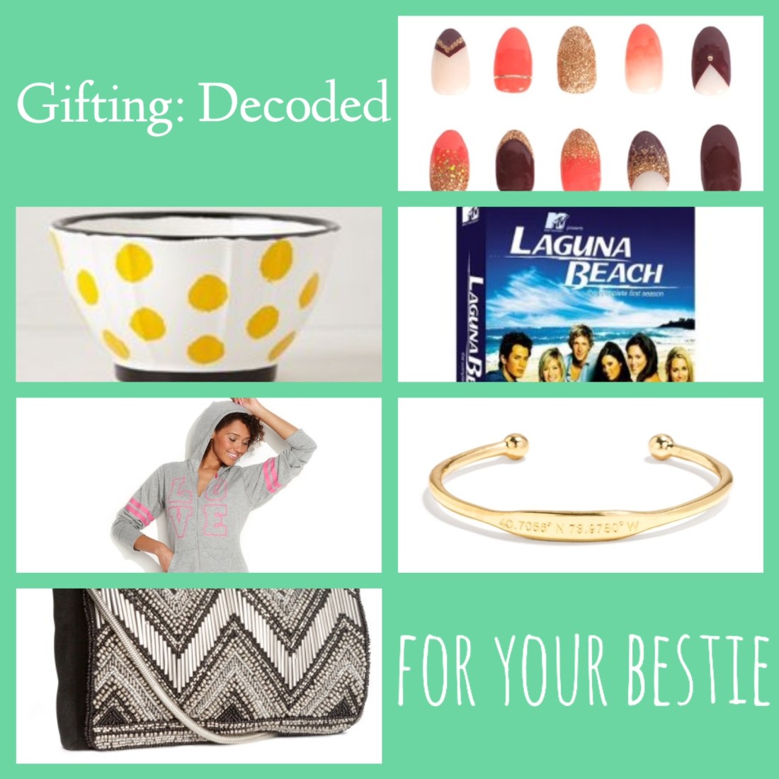 This first installment of “Gifting: Decoded” is focusing on your best gal. Let’s be real: by the time you’re 29 like I am, you and your friends pretty much stop getting/giving gifts. I now mostly only get presents from my immediate family and boyfriend. When it comes to friends, I find most people just bring a bottle of alcohol whenever they go over to a buddy’s place. But the thing is, everyone LOVES getting presents. Since friends don’t often give each other gifts, when I do get one I feel like I must be super special. Don’t you want your friends to feel super special? I’m not talking about fancy gifts. I once received a cookie jar and was over the moon. That’s why this guide is going to stress the inexpensive. It doesn’t shouldn’t be pricey. It just needs to be right.