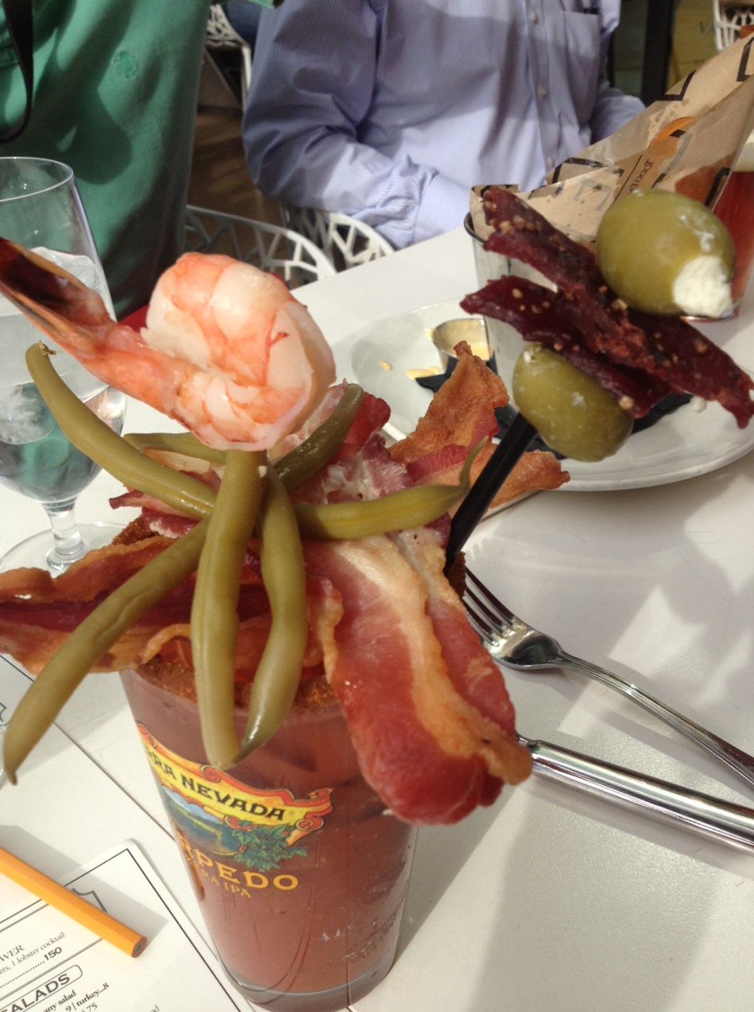 Two years ago, my brother was in Vegas and texted me a picture of the most ridiculous looking bloody mary I’ve ever seen. There was a mini cheeseburger perched on the rim. It was so over the top…and I had to have one. I’m sure he thought I forgot about it, but an outlandish bloody mary is something that is branded into my cerebral cortex so, two years later, when I found myself in Vegas with my brother I casually suggested we go to “that bloody mary place.” No I didn’t. I begged him and my parents til I wore them down and they had no choice but to go to Todd English P.U.B. with me.