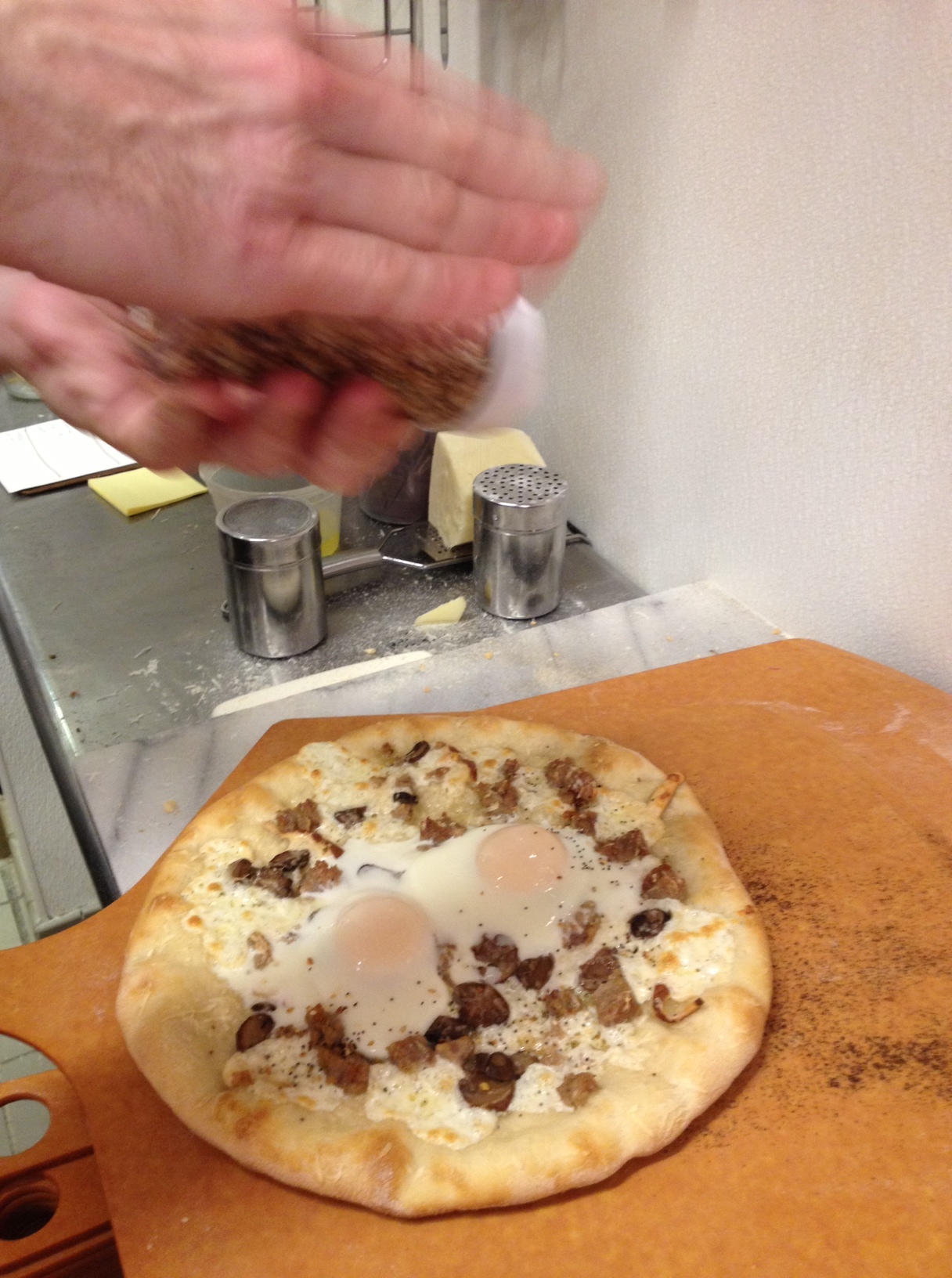 After the demo, we all got to make several pizzas. There were some pizza school approved recipe suggestions, but I decided to go rogue when I saw the somewhat under-used spice cabinet. It was there that I spotted everything bagel spice mix – something I saw once online and have been searching for. I built my pizza around that spice, going with a breakfast theme. First, I topped my crust with smoked mozzarella, sausage, and mushrooms. Into the oven it went. Halfway through, we put two eggs on top and then the spice went on once the whole thing came out of the oven.