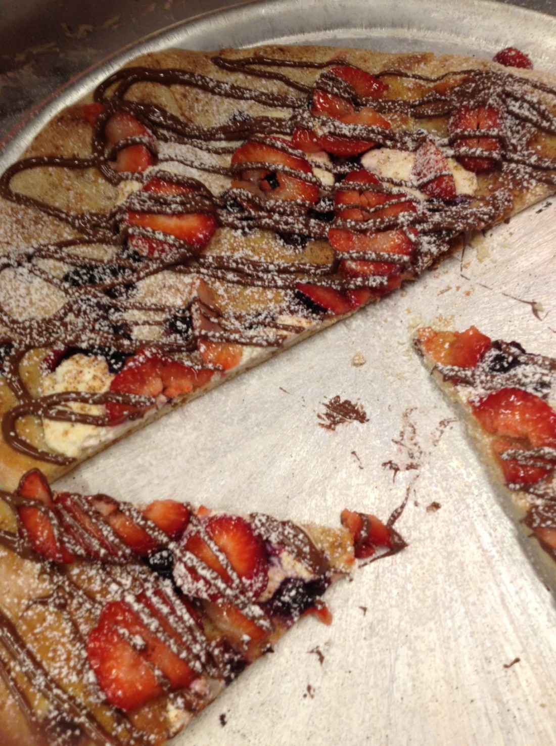 Pizza number two was a dessert pizza that I was splitting with Patricia and she had major eyes for nutella. We placed a few dollops of ricotta on the crust, along with some blueberries and cinnamon sugar. When it came out of the oven, we topped it with sliced strawberries, nutella, and powdered sugar.