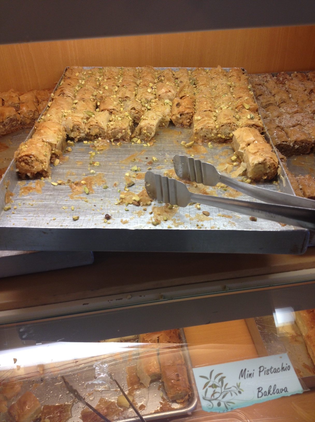 There were rows of cookies and beautifully topped cakes but it wasn’t til I rounded the corner that I found the wall of baklava and galaktobureko I was looking for. Daddy got the traditional baklava and ate it outside like a fiend, with honey dripping down the sleeve of his leather jacket. I patiently saved mine til Sunday afternoon at the precise moment when I needed an ugh-my-parents-are-gone-and-I-have-to-go-back-to-work-tomorrow treat to get me through the day. My two mini baklavas (one pistachio, one chocolate) were the perfect pick-me-up.