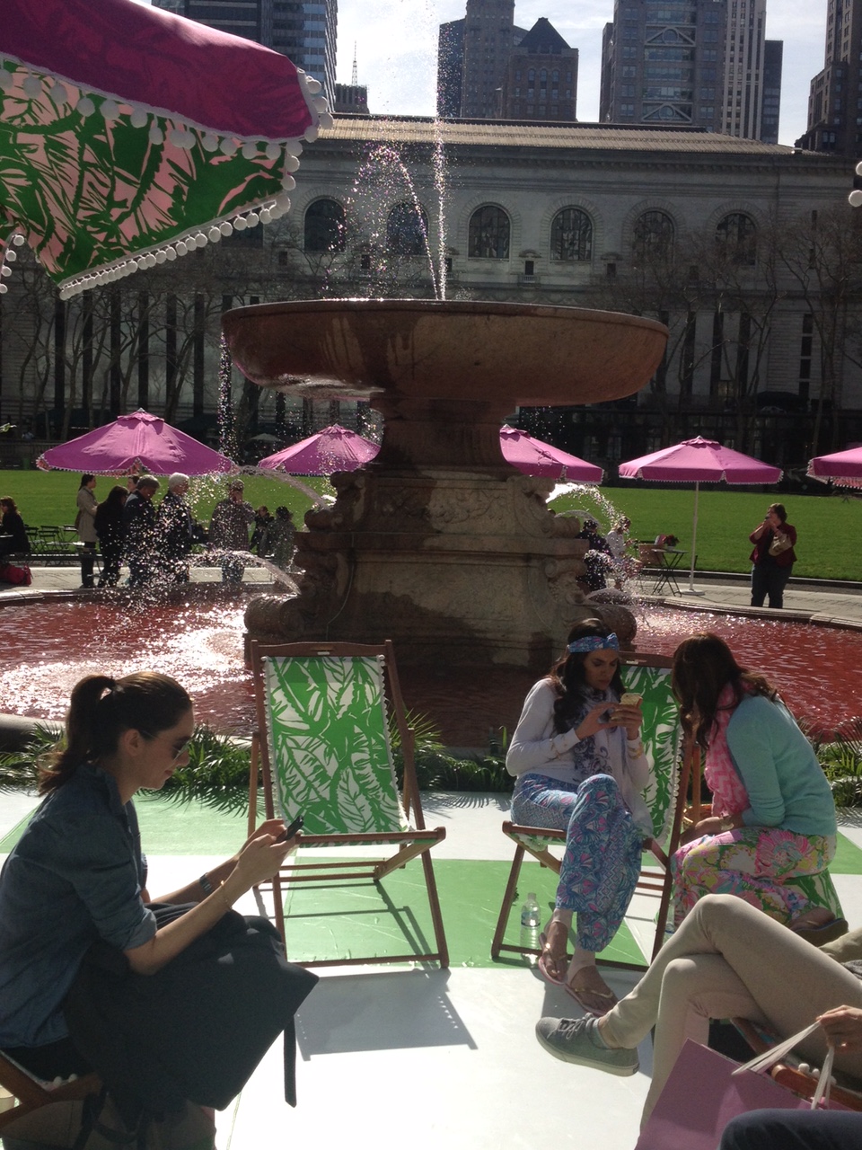 As you probably heard, the Lilly Pulitzer for Target collaboration broke the internet. It was pretty much impossible to get clothes. Luckily, I heard about a pre-sale in Bryant Park so I snagged a few pieces (in love!). After grabbing the goods, I walked through the Lilly area they staged on the 6th Ave side of the park. The cheerful space (they turned the fountain pink!) put me in a great mood for work.