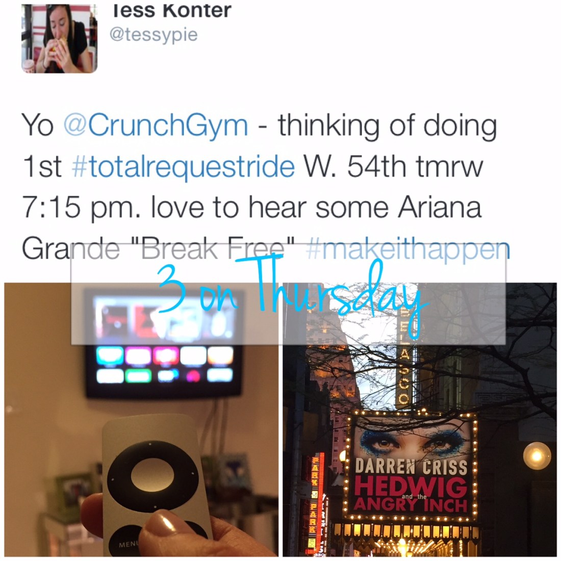 I recently participated in a spin class at Crunch called #TotalRequestRide. First of all, if you don’t get the Total Request Live (RIP), aka TRL, reference…that makes me sad…and old. Basically, you tweet at @CrunchGym during the week and request a music video. They plan the class around the videos and the spinning (hills, sprints) is tied to the beat. I figured if I made a request I’d be locked into actually going to the gym and it worked. I was so pumped when they played my request! I’m not opposed to Soul Cycle, but with classes like this included in my membership, I don’t really feel the need to go elsewhere.