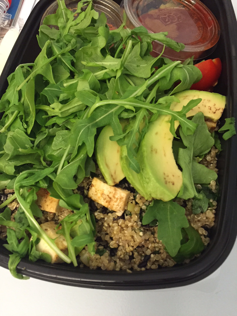 And it was great. I ordered the most vegetarian thing I’ve ever ordered in my entire life. The quinoa crunch wrap actually didn’t have any sort of wrap. I’m pretty sure they accidentally gave me the quinoa crunch bowl instead. Basically the same and now that I’ve eaten it, I really don’t care. It’s made with quinoa tabbouleh, arugula, cucumber, radishes, tomato, avocado, edamame hummus, chipotle vinaigrette, and hot sauce on the side. I added garlic lime tofu as my protein. I have no idea why I went tofu when there were chicken and fish options. That’s something I’ve never done before. But it was great tofu – not at all mushy.