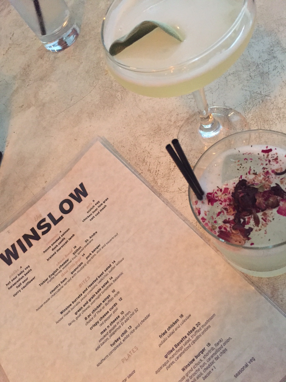 Beth waited til we got to The Winslow to tell me it was a gin bar.  She knows I’m all about the whiskey/bourbon.  Ever heard that Toby Keith song “Whiskey Girl”?  That was written about me.  Seriously.  Well, not actually, but it may as well have been.  The Winslow has a fully stocked bar, but you wouldn’t know it by looking at the drink menu, which is entirely gin.  I’m not a gin girl, but I’m really not a gin and tonic girl.  It’s a shame, because they have a huge list of gins paired with different infused tonics (made with ingredients like bee pollen, juniper, and rose petals).  If G&T is your go-to drink, you should definitely take advantage of their selection.