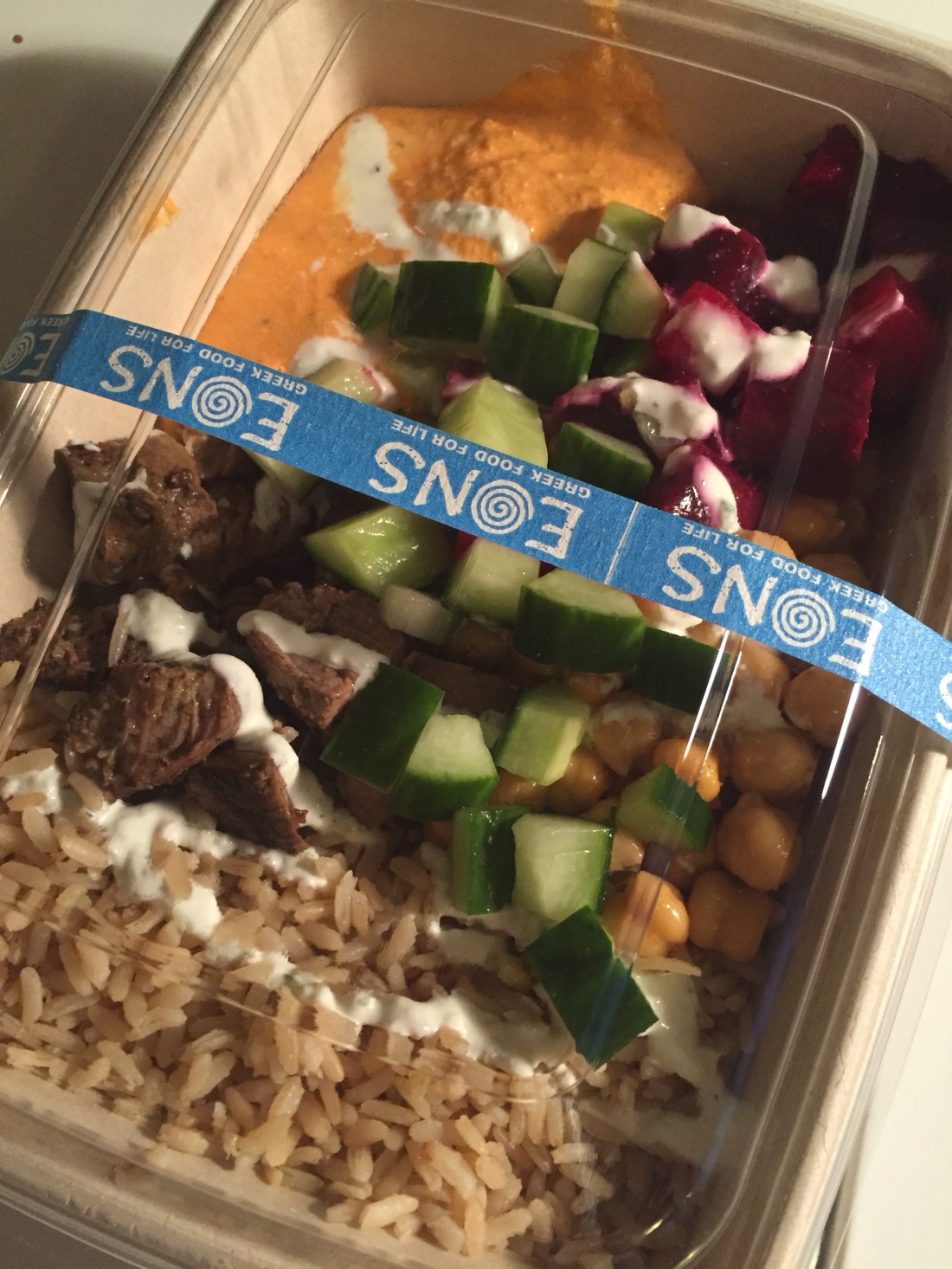 The first step is the same: choose wrap, rice (white or brown), or salad. But then Eons has more options for the proteins, sides, sauces, and toppings. I ordered a brown rice bowl with steak and got chickpeas and beets on the side with feta spread tzaziki, and cucumbers. I kept my beets separate because I like to keep em sweet, but after I ate those up I mixed everything together until it was my big fat Greek rice bowl. Everything was fresh, perfectly seasoned, and tasted so darn good that I ate the whole thing before I realized what happened. And not for nothing, everyone was super nice, including the owner working the register. As he rung me up he asked “First time?” When I responded yes he said “Well I hope you live close by and can visit us often!” I will, Mr. Owner, sir. I certainly will.