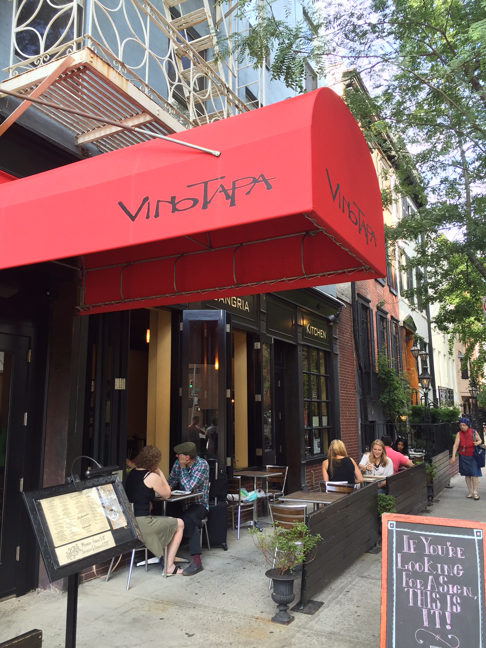 I love when a happy hour goes beyond 7 pm. I am a working gal and can’t usually make it to a bar with enough time to take advantage of the specials when they end at 7. Vino Tapa‘s happy hour ($5 drinks) lasts until 8 pm so I’ve got plenty of time to enjoy. On the weekend, when I happened to try it, the happy hour starts as soon as the place opens (instead of the weekday 5 pm start time) so we we able to enjoy cheap post-brunch cocktails on Saturday. In addition to our drinks, we ordered a meat and cheese plate. I was very good so now I’m interested in trying the other menu items. Vino Tapa is located on a beautiful, tree-lined Murray Hill street so it’s a great place to sip on a glass of wine outside during this gorgeous weather we’re having. As it gets cooler, however, it has that dark Spanish vibe inside that will be great for cozying up.
