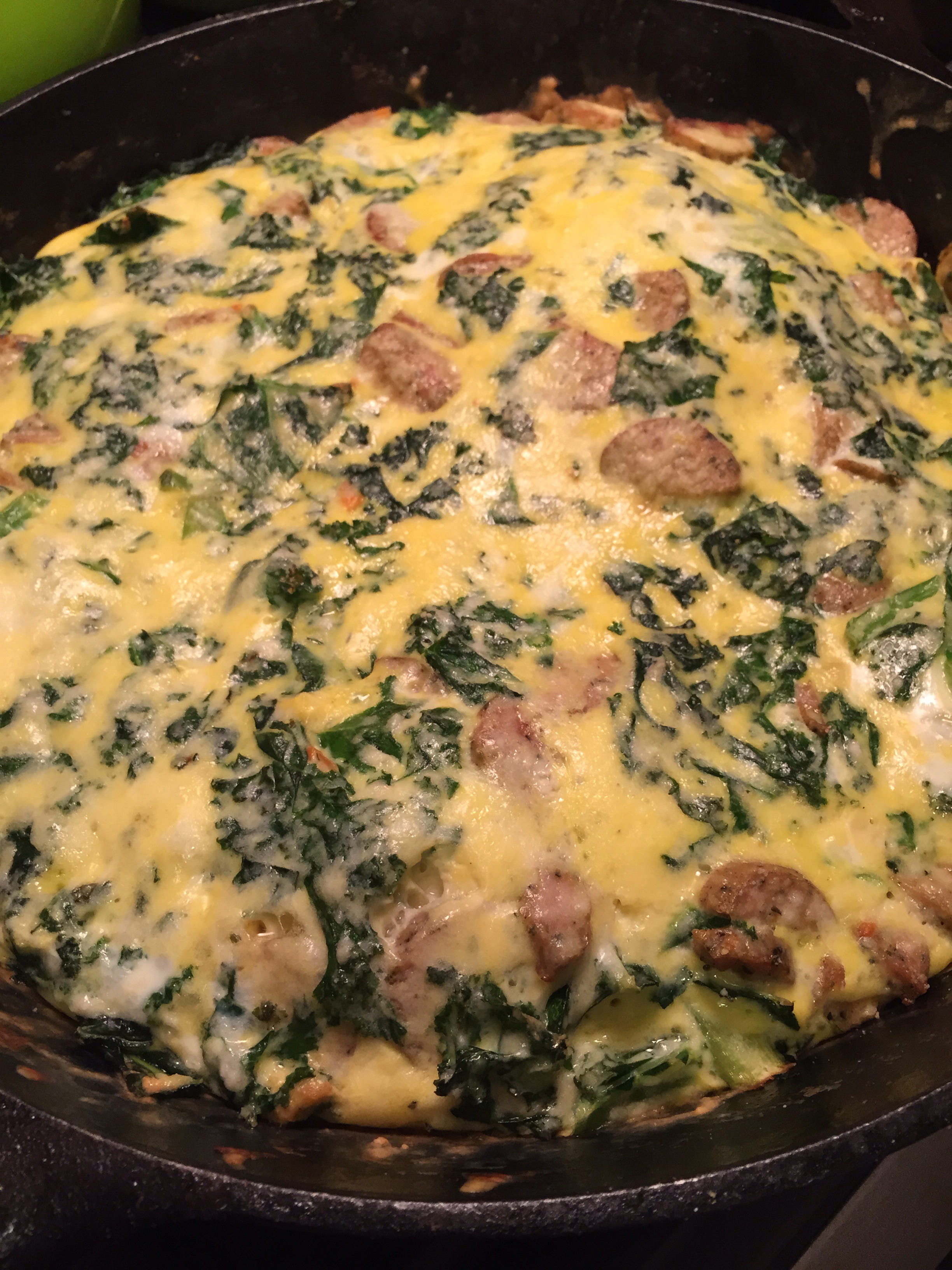 Start by sauteing kale with garlic in your cast iron skillet. Once it’s most of the way cooked down, add sliced chicken sausage. I don’t have exact measurements, but I used about 4 large handfulls of kale and 3 sausage links to really pack it with the filling. Let me tell you, I felt so healthy watching all that kale go in the pan. While the sausage and kale finishes cooking, whisk 10 eggs (my skillet is pretty big) with a bunch of grated pecorino (or parm if that’s what you can find). The whole thing goes into the oven at 350-400 for 10-15 minutes.
