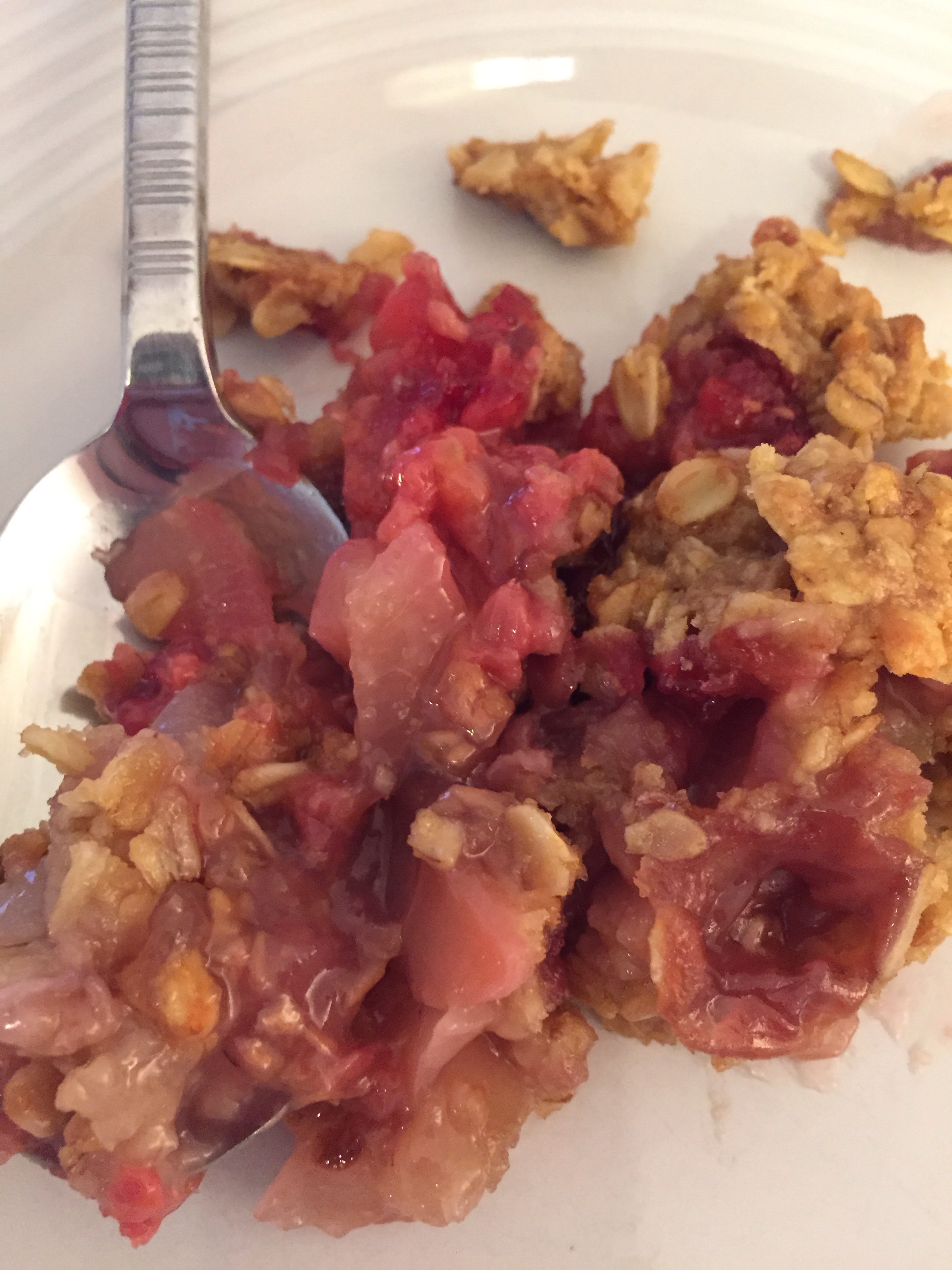 I sliced three white nectarines and tossed them in a pyrex pie pan with one package of raspberries, 1/3 cup of sugar, and 2 tbsp corn starch. Then it was time for the topping, the crisp part of the crisp. For that, I mixed 1/3 cup flour, 1/4 cup light brown sugar (packed), 1 cup oats, and 1 stick (1/2 cup) butter. I mixed it all up by hand until the butter was incorporated through and I could crumble it up. Scatter the topping over the fruit and bake at 375 for an hour, maybe 5 minutes more. Then let it cool for an hour. Then enjoy those last bites of Summer. I’m sorry; that was depressing. Enjoy this because it’s delicious not because it’s the end of the best season ever.