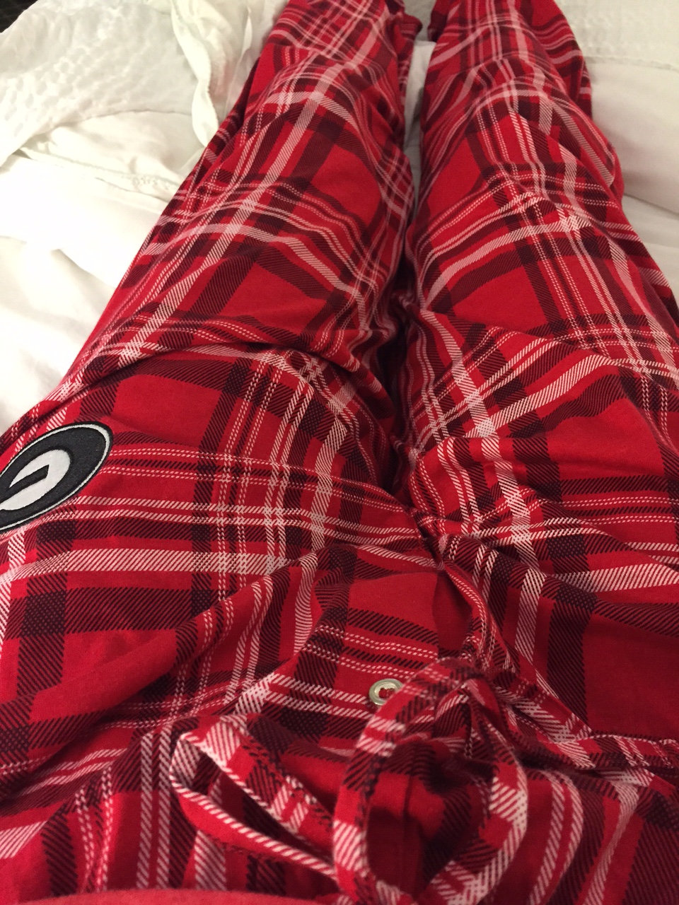 I managed to pack pretty perfectly for this trip – nice and light…except I forgot pajamas. I had thought to bring an extra tshirt but no bottoms. Needless to say, my first night in the hotel wasn’t super comfortable. For night number two, I bought a pair of pajama pants in downtown Athens. It was not a purchase I intended to make, but I’m glad I did. I can’t believe I thought I was living before I owned these. I needed a pair of pjs with the Georgia G on them.