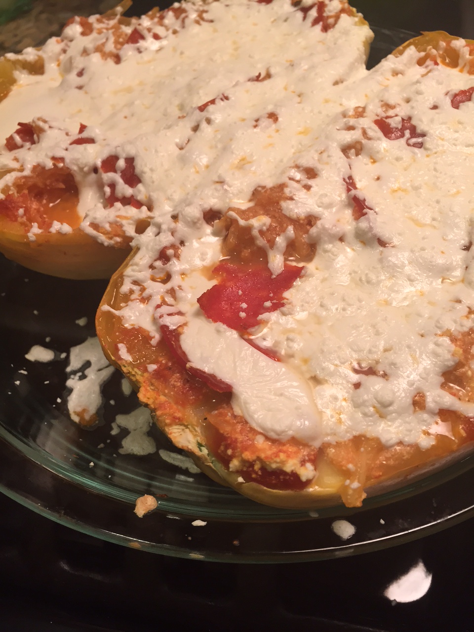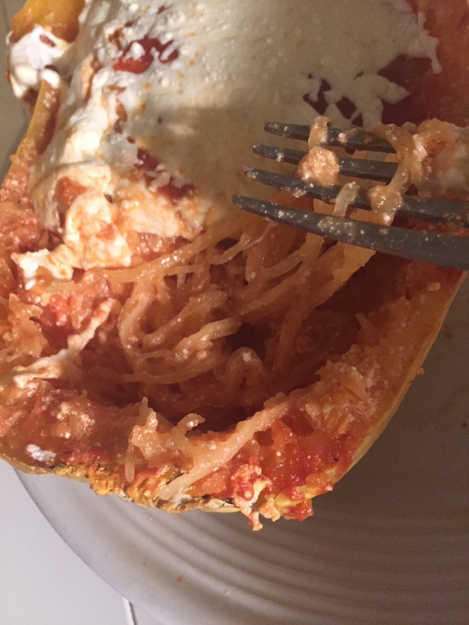 Now, to make it pizza squash (a much better cartoon name than Spongebob Squarepants, if you ask me), start scraping the flesh of the sqush with a fork til it’s nice and stringy. Then mix in ricotta, marinara sauce, and pepperoni. Top with shredded fresh mozzarella and pop in the oven until the cheese on top gets bubbly. No measurements – whatever looks good.