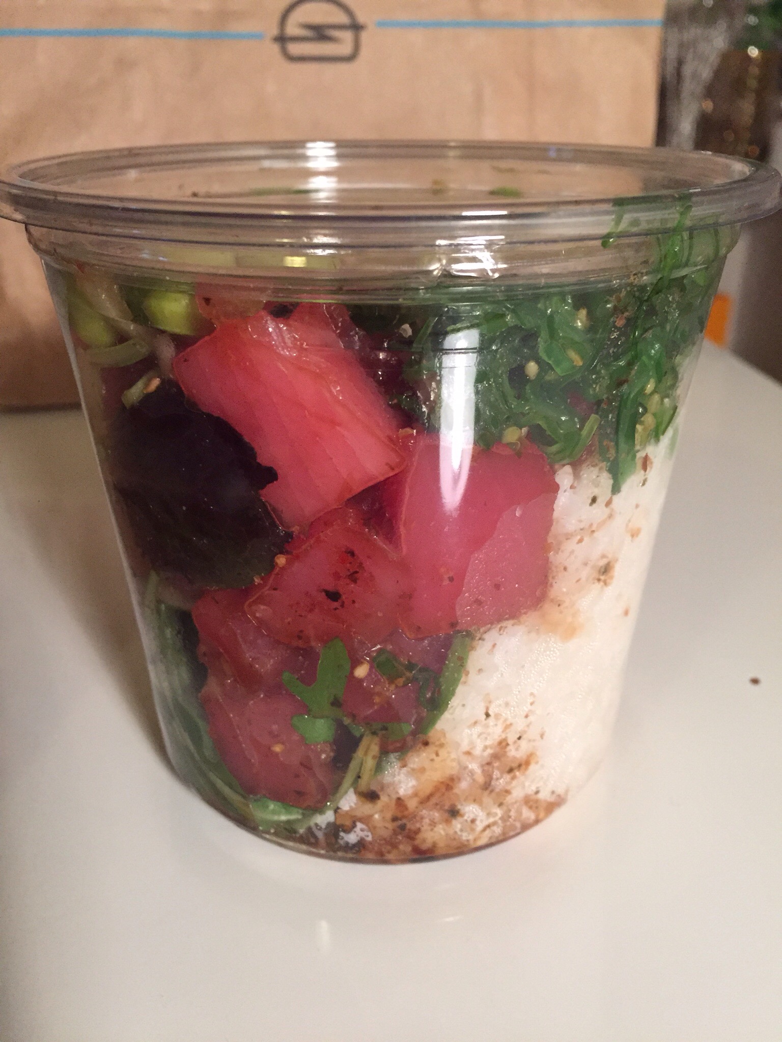 I wanted to order a half and half poke bowl with tuna and octopus, but they ran out of octopus so I got all ahi and added avocado and edamame with spicy sauce on the side. I was pleasantly surprised, first by seeing the portion size, and then by tasting the freshness. For less than $13 (including the extra avocado and edamame) you get a huge cup of yumminess – you couldn’t spend that at any sushi place and get this much food. Plus, the only other time I think of raw fish to go is the sushi counter at Duane Reade. No thank you.
