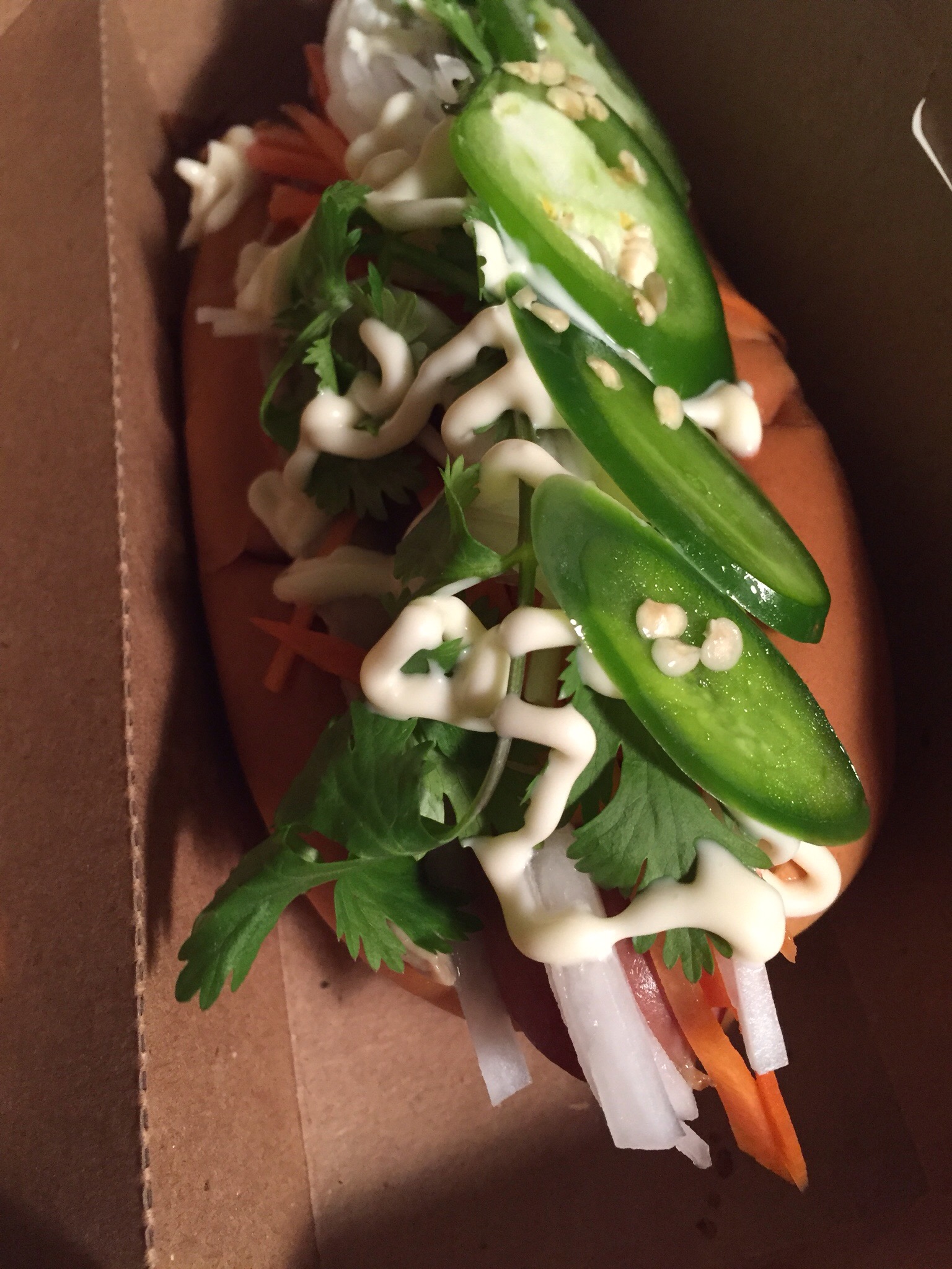 I also ordered a banh mi dog. I’m not sure why, considering I don’t really like hot dogs, but it looked interesting and for $4.50 I thought “what they hey!” Another pleasant surprise! The cilantro, mayo, and pickled salad was a totally new taste for the hot dog department. It was also pretty big, for a hot dog. I [wrongly] assumed the poke would be a tiny cup so I thought I’d need more food. Now I had two food items that were bigger than I thought they’d be. I ate all of it, of course.