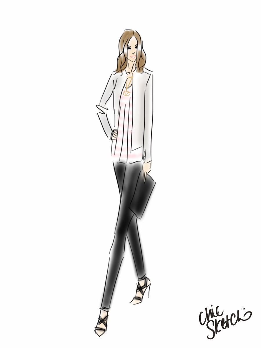 I have never actually owned a pair of black leggings.  They always seemed to trendy for my classic/preppy style, but I figured for $30 I could try them on for size.  I bought these from Zara ($29.90) and paired them with strappy sandals with a slight platform (Nine West, old, but I think around $40).  On top, I wore a lightly patterned breezy peach tank (~$30) and layered two different gold necklaces (~$14 each).  I got the top and both necklaces at a great DC boutique called Violet.  The final piece of jewelry was a cuff with large black “stone” from Charming Charlie (~$8).  Finally, I tossed on an old leather jacket (TJ Maxx) and carried a simple black clutch (Kate Spade Saturday).