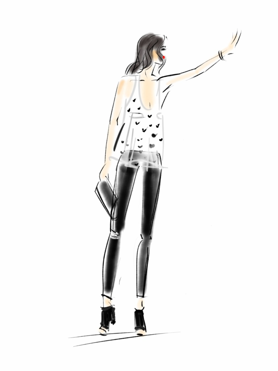 I wore super ripped black jeans from Zara ($69.95), a Yumi Kim racerback top with a simultaneously funky and cute broken hearts pattern (on sale for $30), some perforated suede peep toe slingback mules (DSW – $69.95), and a clutch by Kate Spade Saturday. Finally, I tossed on some bangles from Henri Bendel and green and black earrings that were an Xmas gift from the very friend I was hanging out with that night.