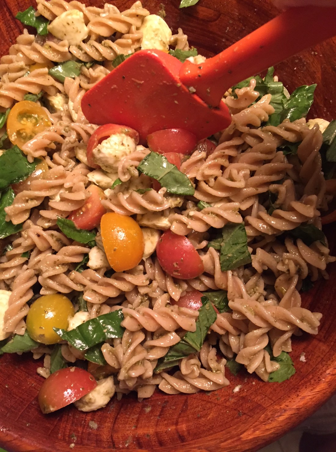 My beau was concerned we needed one more side dish on our 4th of July spread and was really feelin a pasta salad. I was not so convinced. Pasta and potato salads are usually mayo based…not so great for sitting out in the sun all day while people graze. “So just create a pasta salad without mayonnaise,” Albert said. “You’re a good cook. You can be creative.” You know what I AM a creative cook! I can make this work! Thanks for the pep talk, Coach!