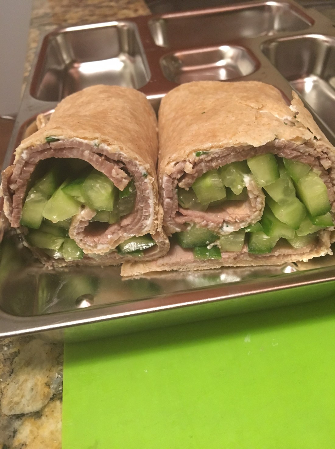 Spread 1-2 soup spoons of light cream cheese on a whole wheat tortilla (not sure how big your tortilla is). Sprinkle chopped chives over the cream cheese. Top the spread with slices of roast beef. Add julienned cucumber for crunch and roll the whole thing up.