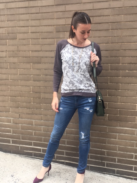 This sweatshirt (Lord & Taylor, old, ~$25) is just as cozy as any sweatshirt (meaning, super cozy), but the lace on the front means I can totally wear it out to a brunch with friends. I paired it with ripped jeans by Blank (old, ~$85) and a long necklace from Loft (old, ~$20). I carried a forest green bag from Kate Spade. But what really made this sweatshirt outfit fun and brunch appropriate were the heels. I wore suede pointy toed heels in a boysenberry color with a wide ankle strap from Zara (old, ~$45). I also wore a lipstick in a similar color. I’m loving these deep berry hues this season!