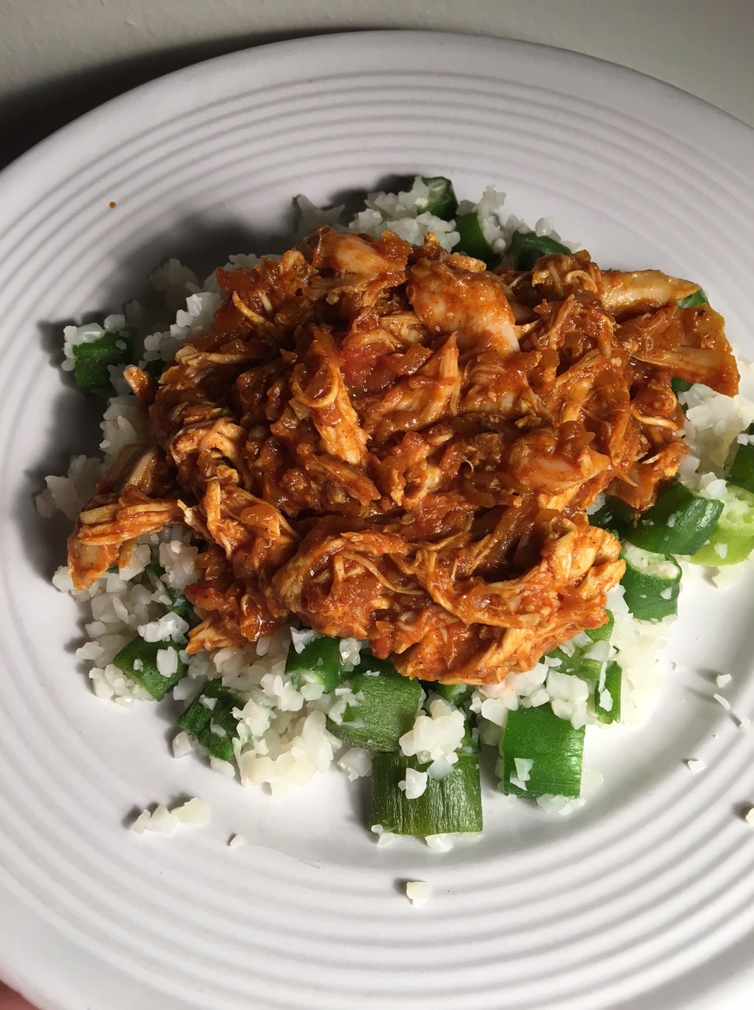 Once the okra cauliflower rice mixture is done, set aside on a platter and make your chicken. Use that same pan to combine 3/4-1 full shredded/chunked rotisserie chicken with one jar of Trader Joe’s Curry Simmer Sauce. Do as the name implies and simmer until it’s all warmed through. Serve over the okra cauliflower rice.