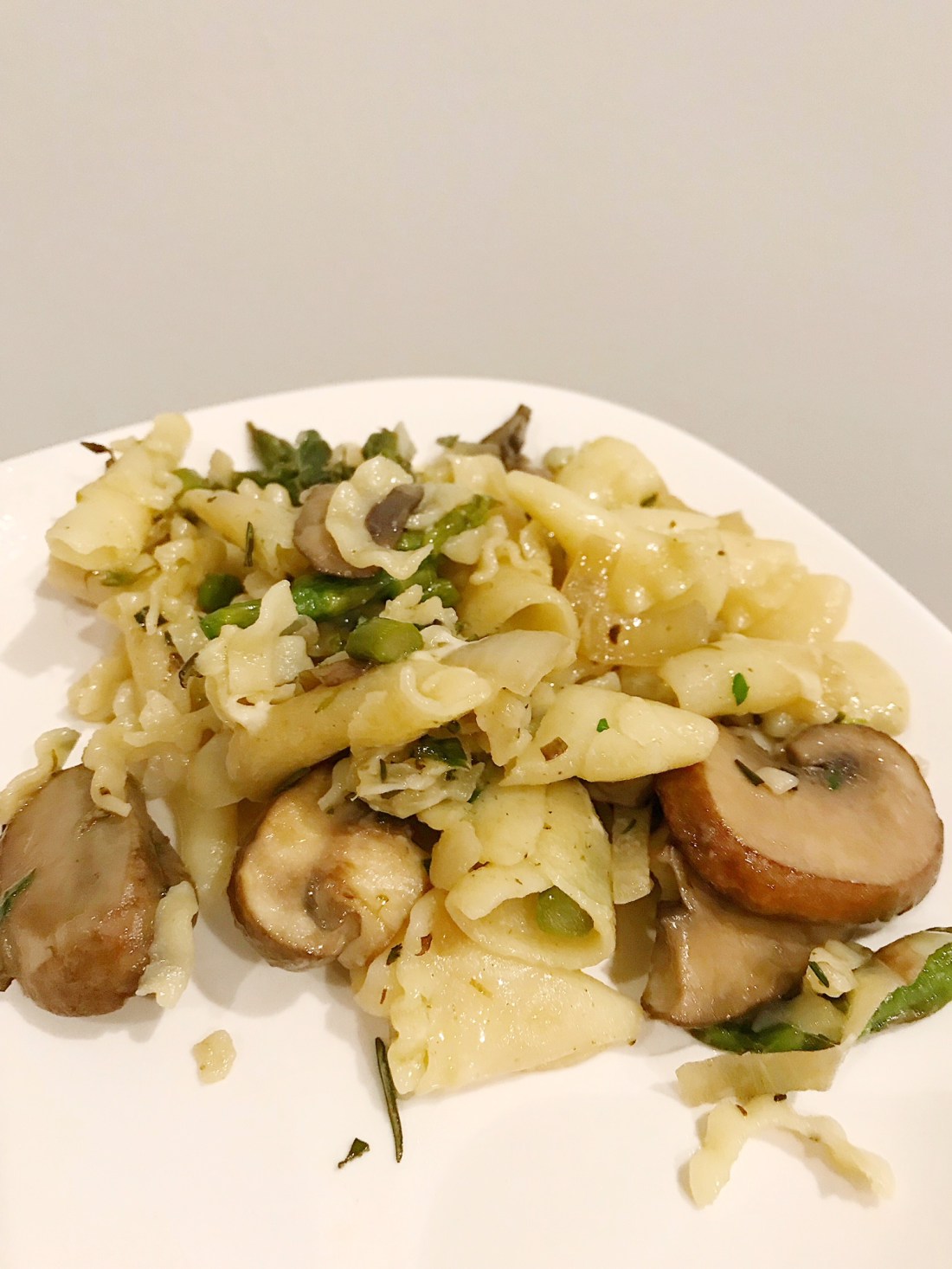 For the rest of the dish, start boiling water while you cook your veggies. I used white onion, cremini mushrooms, and asparagus. The onions will take the longest, so start them first, followed by the mushrooms, and adding the asparagus last. I really liked this mix of veggies because the asparagus felt bright and almost spring-like, while the creminis felt like more or a winter veg. Since it was a cold January day, I also chose more winter-y herbs (mint and basil, for instance would have felt much more summer-leaning).