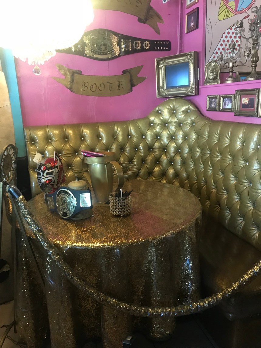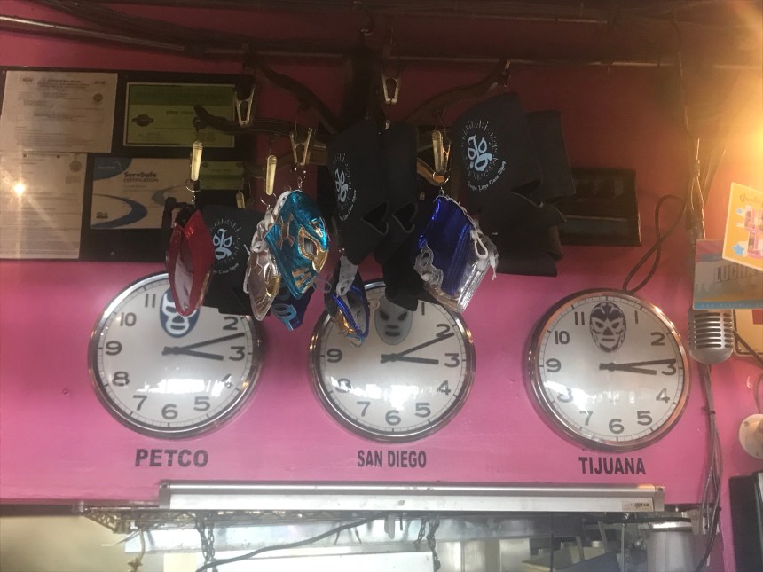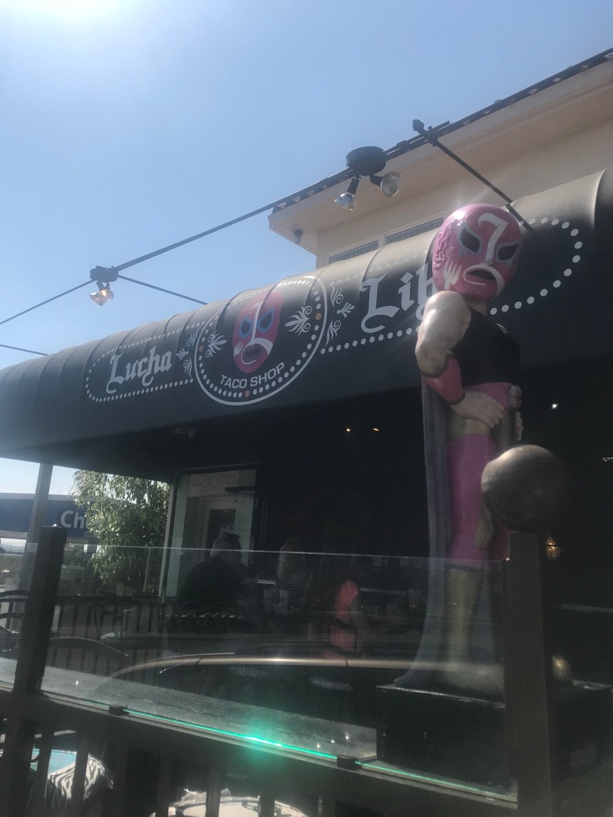 Post-park, we hit up one more taco spot. Since our arrival, we had been hearing about the California Burrito, which includes French fries in its filling. I couldn’t not try a local specialty! Our friends suggested JV’s, but we were so close to Lucia Libre, which was tied with JV’s for most recommendations, so we walked there. LOVED it. The restaurant is fun, pink, and kitschy with luchador masks everywhere. They also have a legit salsa bar and Mexican cokes.