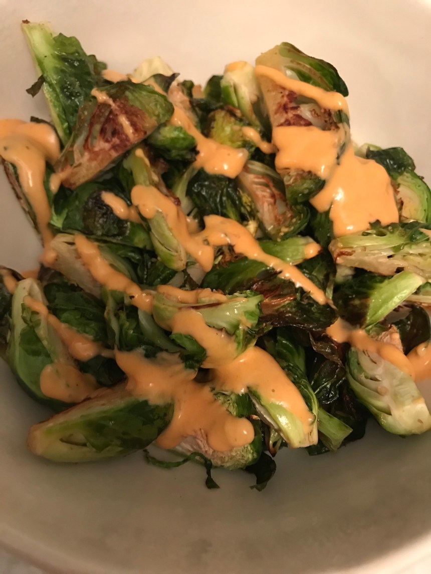 First, toss quartered Brussels sprouts with olive oil, salt, and cumin. Roast them at 350 for about 20 minutes (or until they’re nice and browned), flipping halfway through. While they’re cooking, make your sauce of mayo, canned chipotle (I found them already puréed, but if you only find the canned peppers, you can just purée them with the mayo, using and immersion blender), fresh lime juice, and a little salt. When the sprouts are done, put them in a bowl, drizzle with the sauce (be liberal here – I actually went back and added kore later because it was so good), and then top with fresh cilantro and a generous portion of crumbled cotija cheese.