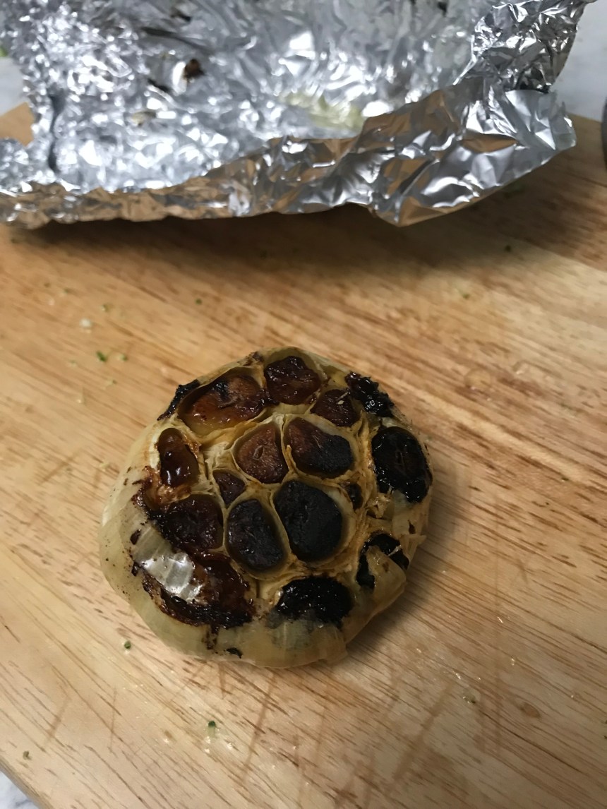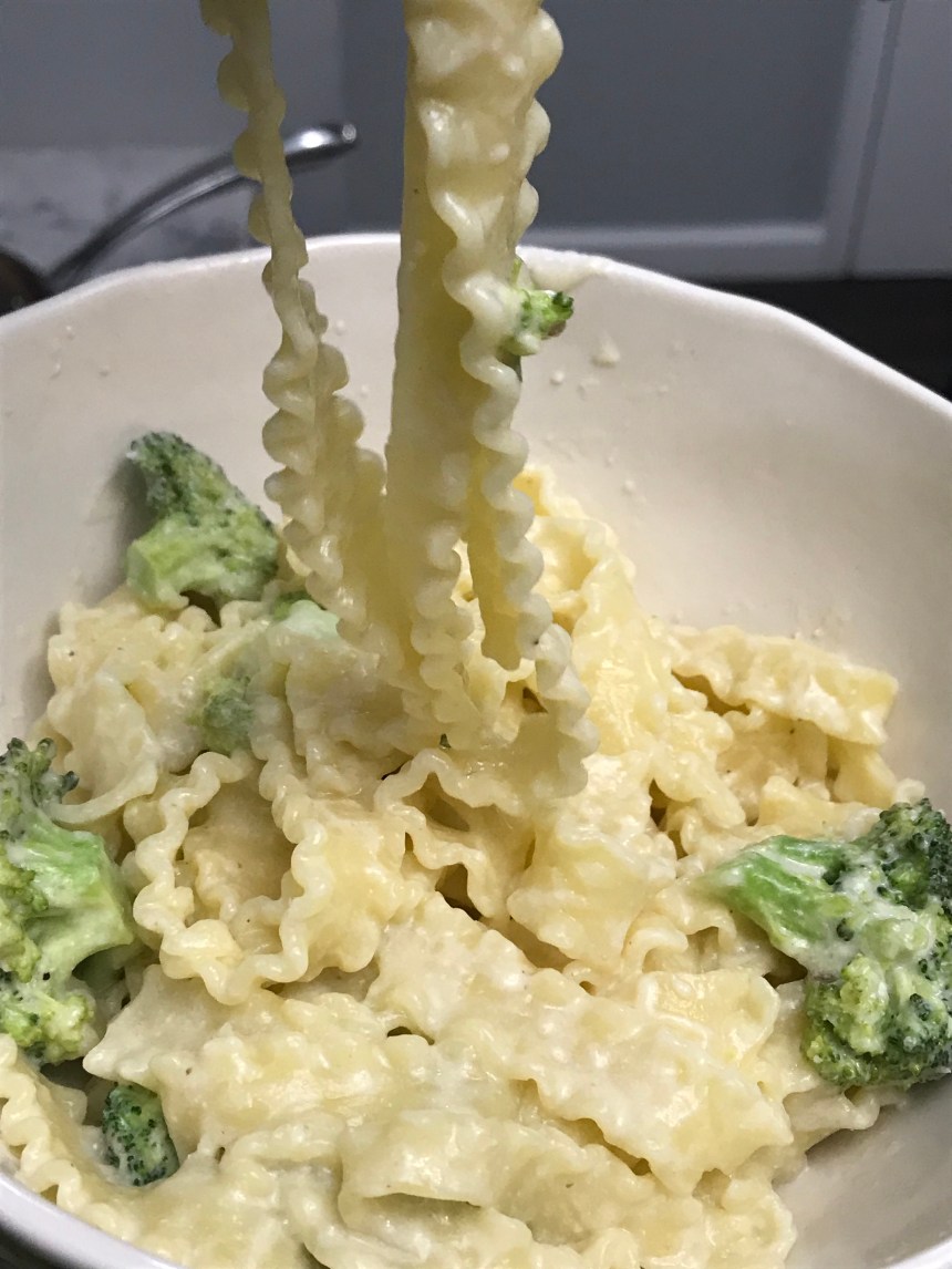 This was so satisfying. It felt like the ultimate Sunday supper. The components are simple. Pasta, cream sauce, broccoli, and shrimp. These are all relatively expected. But the garlic, having been toasted, gives a deep caramelized flavor to the sauce. It’s pretty amazing that you can create a delicious cream sauce with just two ingredients (half and half + parm), but it’s even more amazing that you can make an extra delicious sauce by adding roasted garlic – something that takes no hands-on time. The shrimp adds just the right amount of spice to this dish, too. And the pasta holds the sauce really well thanks to those wavy gravy edges. I’m new to the malfadine world, but it’s a world I wanna live in.