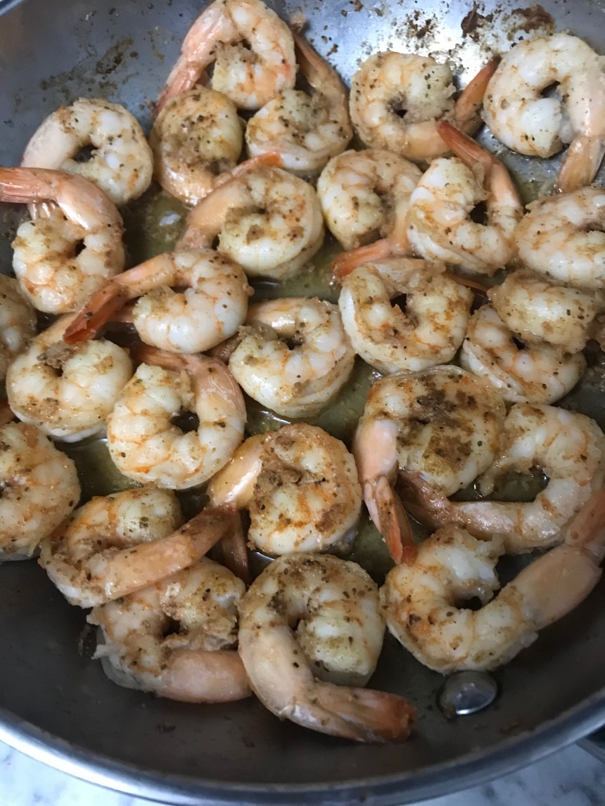 This dish is very easy to pull together – actual active time is maybe 20 minutes. However, one of the main ingredients is roasted garlic and that takes some time. Easy time, but time nonetheless. Start by cutting the top off a full head of garlic, smear oil over the whole thing and wrap it up in aluminum foil. Roast it at 400 for an hour. When the garlic is done, pull it out of the oven, unwrap it, and let it cool a bit while you start on the rest. Start cooking your malfadine pasta while sautéing a head of broccoli in a separate [very large] saucepan. When the broccoli is nice and bright green, add some half and half and a large handful of grated Parmesan. The amount of half and half and cheese you use is dependent on how much pasta and broccoli you’re cooking. I was using a lot of both so I may have used around a cup of half and half (maybe more?) – a ton of pasta was getting made and I needed enough sauce to lightly cover all of it. When you add in those two main sauce ingredients, add in your roasted garlic. At this point, it should have cooled down enough to handle. You can simply squeeze the whole head of garlic and the roasted cloves will pop out of their little pods. Run your knife through it so it’s basically a paste and add it to the broccoli and sauce. Let the whole thing start to simmer while you cook up a pound of shrimp that you’ve tossed in some paprika and cayenne. The shrimp will only take about 5 minutes to cook so when they’re done, set them aside. When the pasta is done cooking, the sauce will be too. Add the pasta to the broccoli and sauce, turning it over till everything is nicely coated. The sauce should not be too think. It’s a light cream sauce, not an alfredo. If you need to, add a little pasta water to thin it a bit. Pile it all in a bowl and add the shrimp to the top.