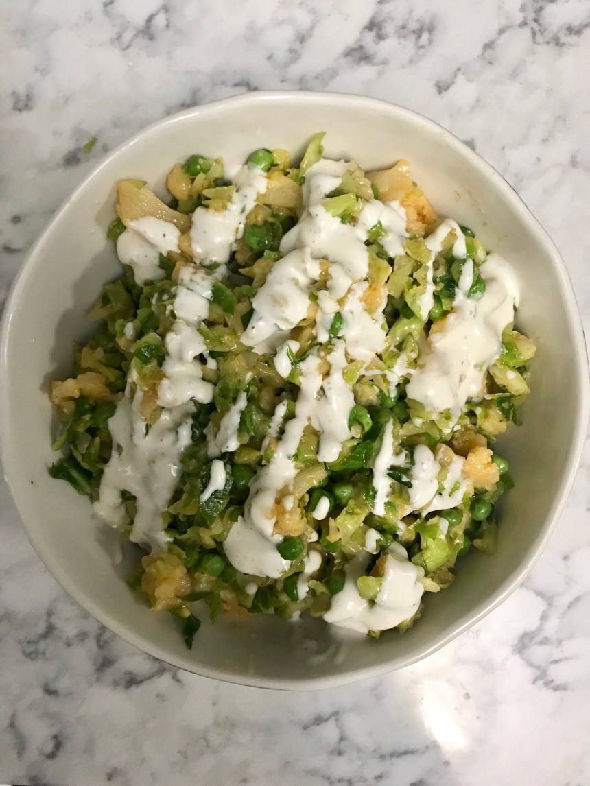 Start by sautéing shredded Brussels sprouts in a large pan with some olive oil and garlic powder. Once it started to wilt, I added in leftover buffalo cauliflower (from one of those steamfresh microwave bags – but you could easily use any leftover steamed cauliflower that you toss with some Franks before adding it to the pan). I chopped the cauliflower a good bit so there were no big florets – I wanted it to go allll throughout this dish. I also added frozen peas around the same time. Now just stir around until it’s all warmed through. Remove from the heat and stir in a handful of shredded cheese (I had Mexican blend leftover, cheddar would also work). Finally, top with a little ranch dressing.