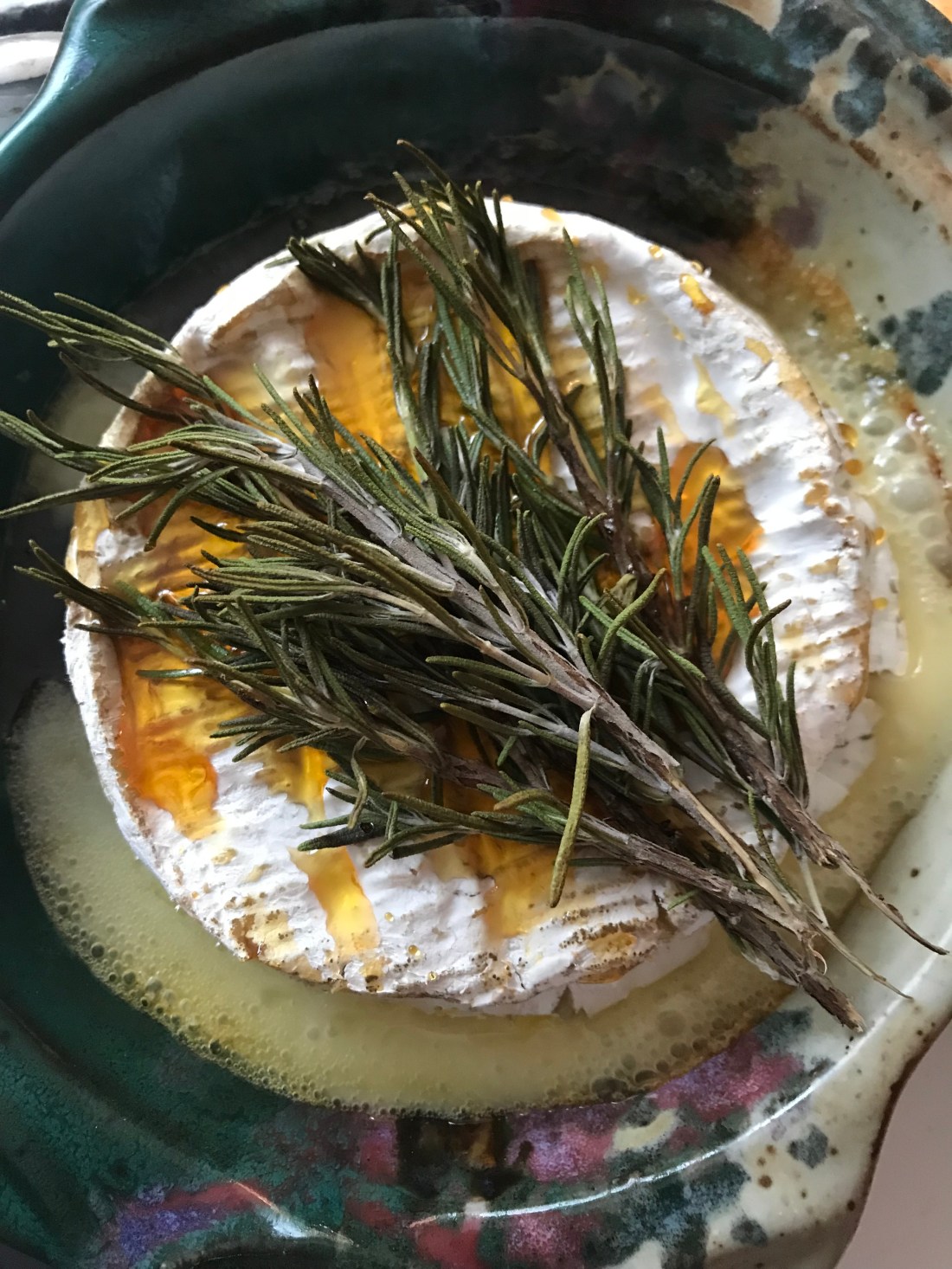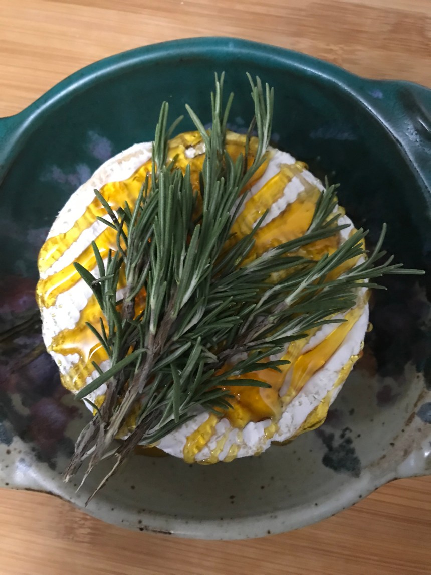 Put a wheel of brie in a baking dish. I have a decorative brie baking dish made for this purpose, but any dish works. Just plop it in. When I say this recipe is simple, I’m not kidding. You don’t have to discard any of the rind. You honestly don’t even need to get your hands dirty. Drizzle honey all over the top. Finally put 4 or 5 sprigs of rosemary on the top. Bake in a 350 oven for just over 10 minutes (just til you see it start oozing out).