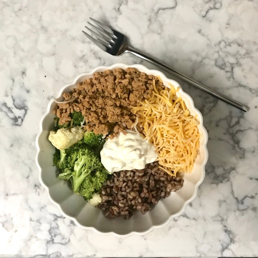 First start some rice in the rice cooker. I used Trader Joe’s sprouted California rice, which is super nutty yummm, but any will do. At the same time, start roasting broccoli and cauliflower florets with some oil and everyday seasoning at around 300. The rice and veggies will end up being done at around the same time – about 25 minutes. When those two ingredients are about halfway done, start sautéing ground chicken with some bbq sauce. For those wondering, I was using the last little bit of a Texas style sauce I found in my fridge (from While Foods). Just use whatever you’ve got on hand – and you won’t need much. I only had about 1/4 or maybe 1/3 of the bottle left and it turned out to be plenty for a pound of meat. With everything cooked, pike the rice in a bowl and start assembling with the veggies and ground chicken. Finish off with shredded cheese, sour cream, and some salt.