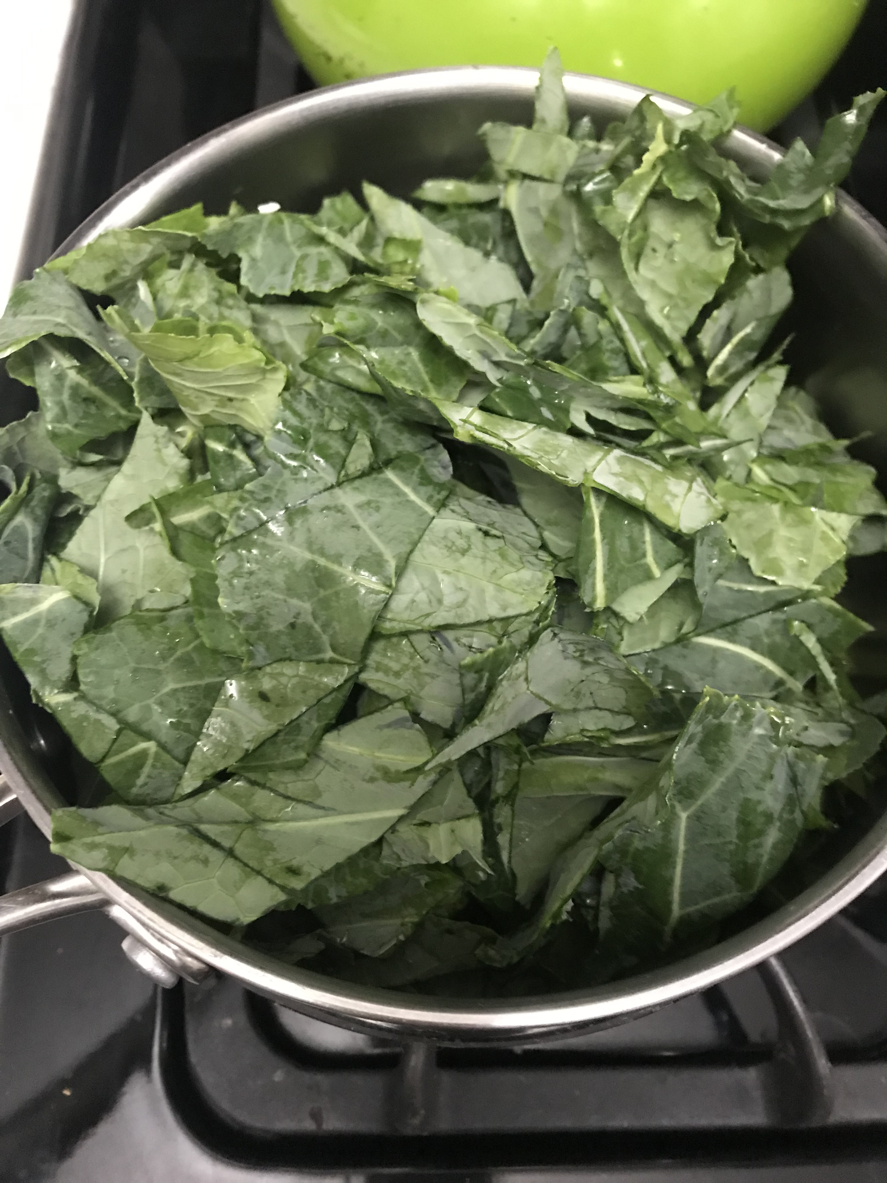 I don’t normally make collard greens myself because they take forever. In addition to the tedious nature of taking the leaves off the ribs, they then have to sit in a stock pot for a couple hours. I definitely don’t have time for that on a weeknight, and on the weekend I tend to forget to start the process til it’s too late. Recently, however, I decided to see if I could do a quick version of collards and cut the time down to about 30 minutes. I was totally winging it, but IT WORKED.