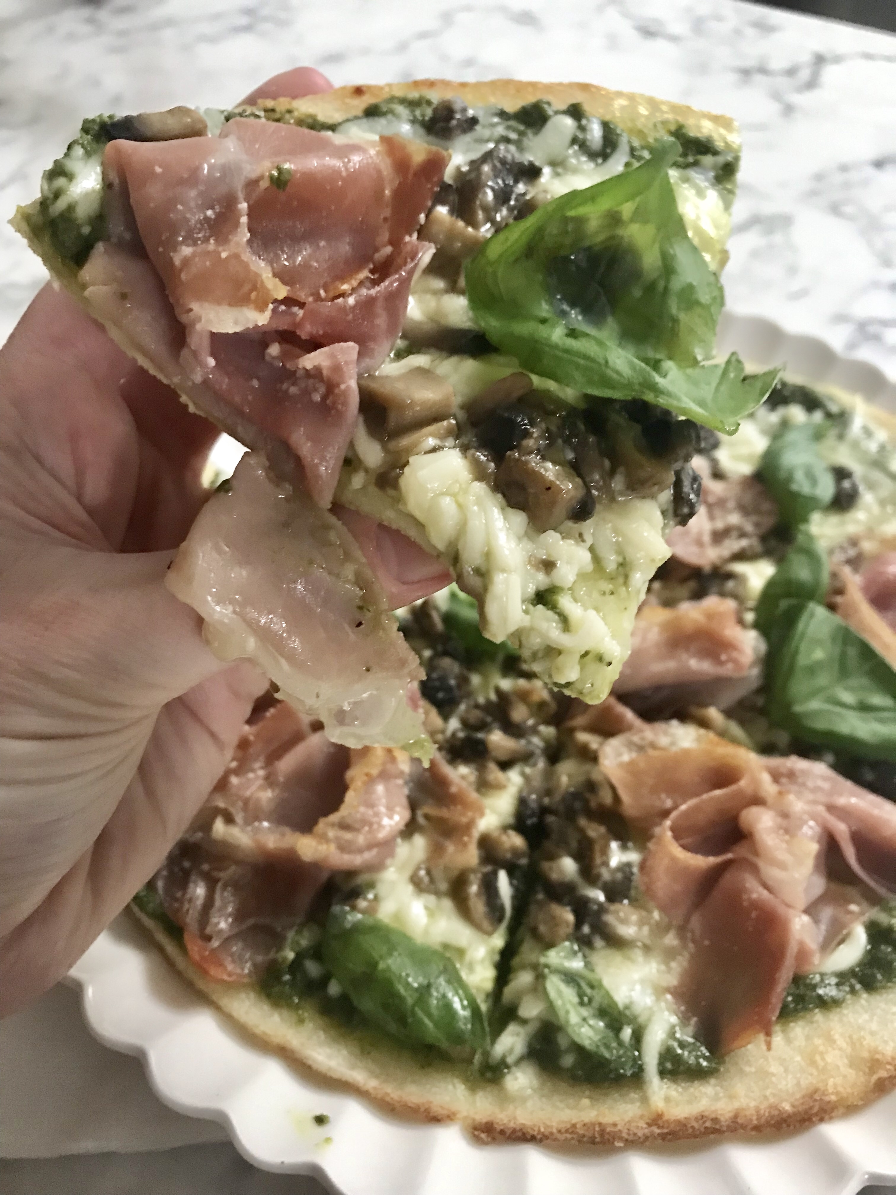 For this “pizza”, I covered my cauliflower crust with pesto and then topped with shredded mozzarella, slices of prosciutto, chopped sautéed mushrooms (leftovers), and grated parmesan. After baking with the toppings, I put on a few leaves of fresh basil.