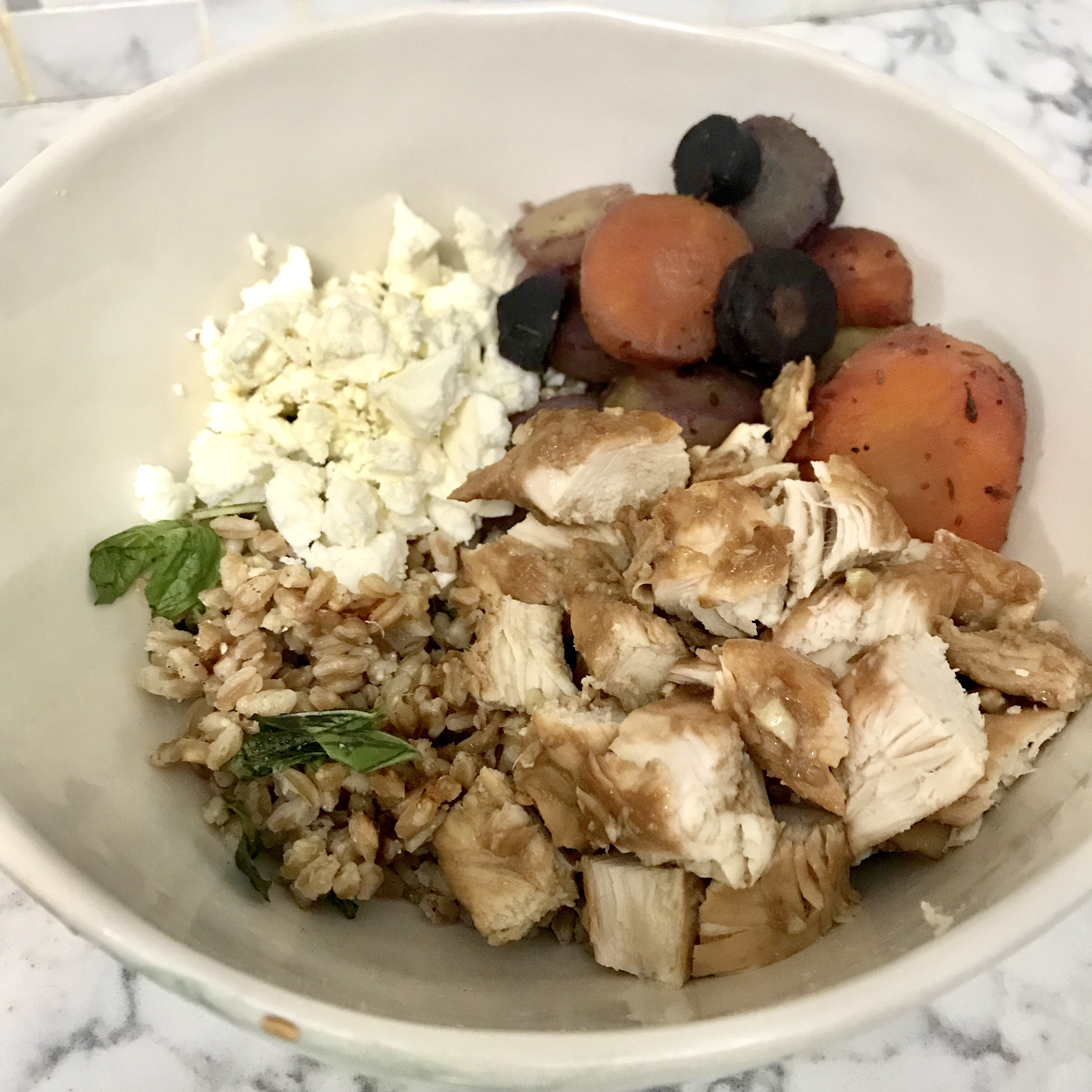 I used quick-cooking farro from Trader Joe’s, and while that fluffed up, I cooked the rest of my ingredients. For the protein, I made balsamic chicken by marinating chicken breasts in balsamic vinegar (the base), olive oil, dijon mustard, and minced garlic. I roasted it in the oven at 375 for about 25 minutes (mine had been cut into strips so it took no time to cook). Before topping the farro with the chicken, I tossed it with some salt, pepper, and fresh torn basil. To round them out, I topped the bowls with Trader Joe’s colorful carrot coins (if you don’t have a TJ’s, simply roast up sliced multicolored carrots, preferably with garlic butter and herbs). Finally, they got sprinkled with some feta.