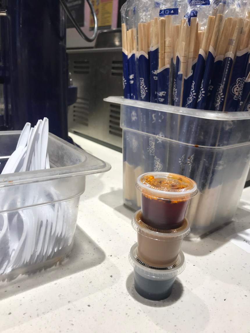 There’s soy, a non-spicy sesame chile sauce, and a peanut sauce. I poured all of them them allllll over those slippery noods.