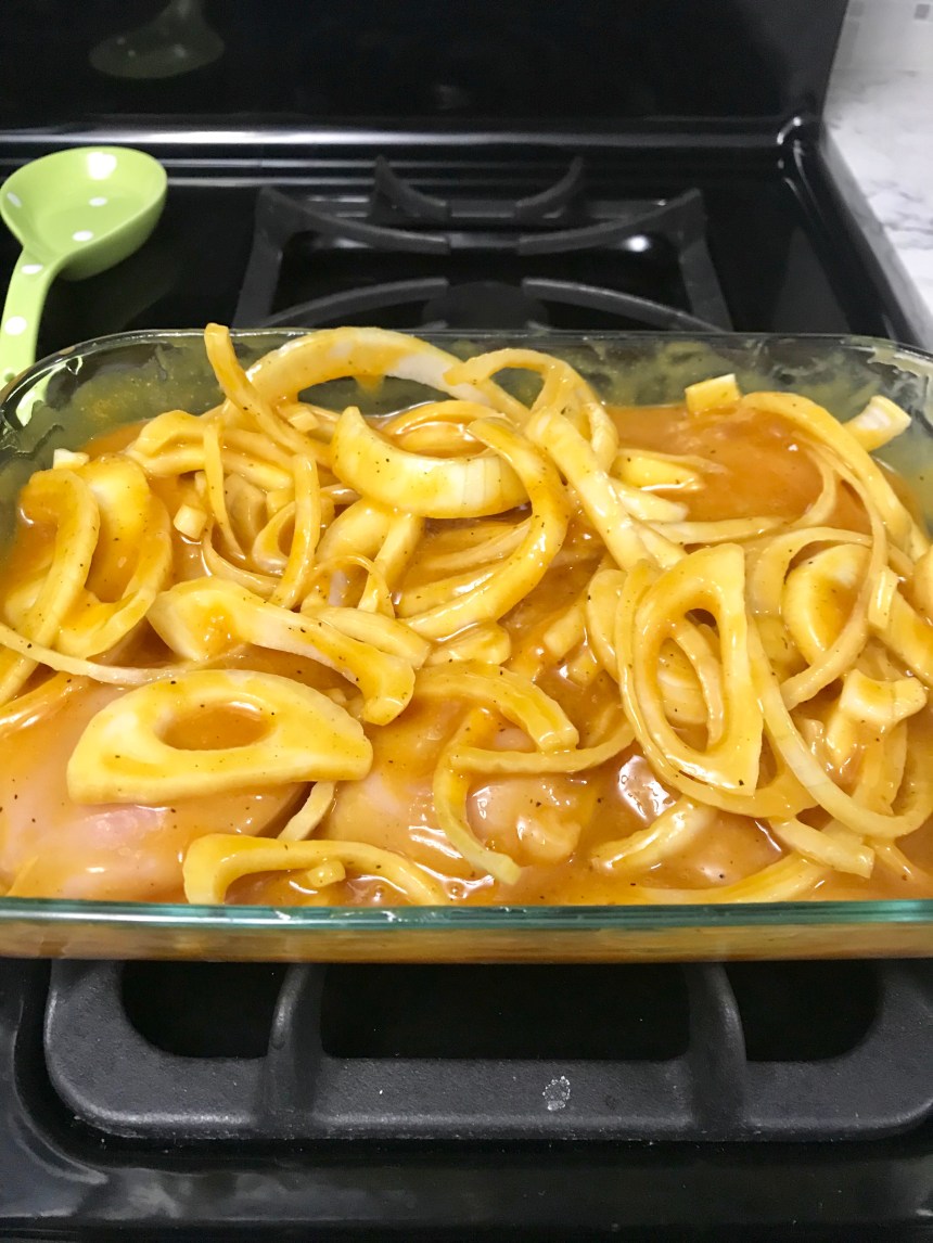 Pour about half a jar of bbq sauce in a Pyrex and stir in some garlic powder. (Don’t be shy with the garlic powder, either – I should have added more.) Add sliced sweet onion to the mix and then add your boneless skinless chicken breasts, flipping them around to coat. I used sweet onion because I don’t love red onion and I put them in from the get go because I wanted them to get nice and soft. Bake at 375 for 20 minutes then top with shredded cheese and pickled jalapeños and bake for another 10 minutes.