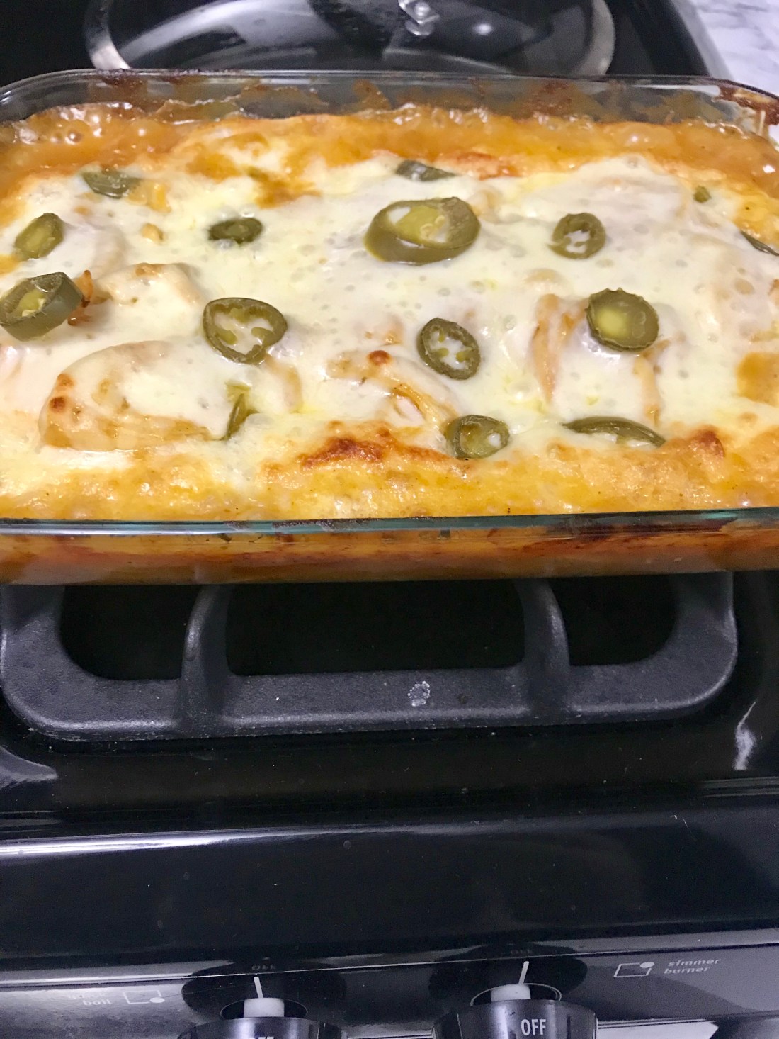 Pour about half a jar of bbq sauce in a Pyrex and stir in some garlic powder. (Don’t be shy with the garlic powder, either – I should have added more.) Add sliced sweet onion to the mix and then add your boneless skinless chicken breasts, flipping them around to coat. I used sweet onion because I don’t love red onion and I put them in from the get go because I wanted them to get nice and soft. Bake at 375 for 20 minutes then top with shredded cheese and pickled jalapeños and bake for another 10 minutes.