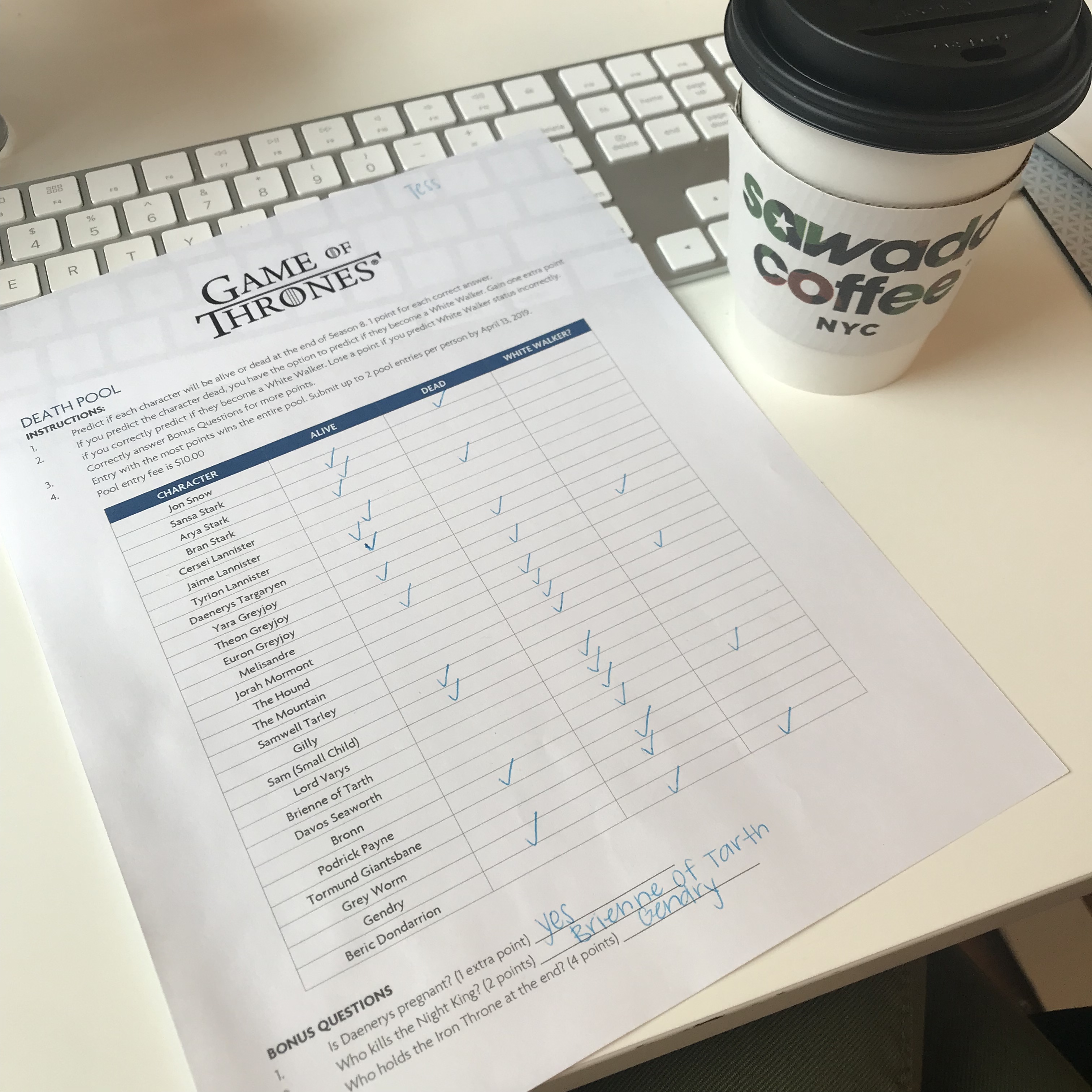 I was worried we wouldn’t be able to do it, but we managed to binge the entire Game of Thrones series before the 8th and final season premiered on Sunday. Now that I’m all caught up, I’m able to join all that fun water cooler conversation and participate in the office’s death pool. (My picks, with some of the delish coffee from the spot below our office.)