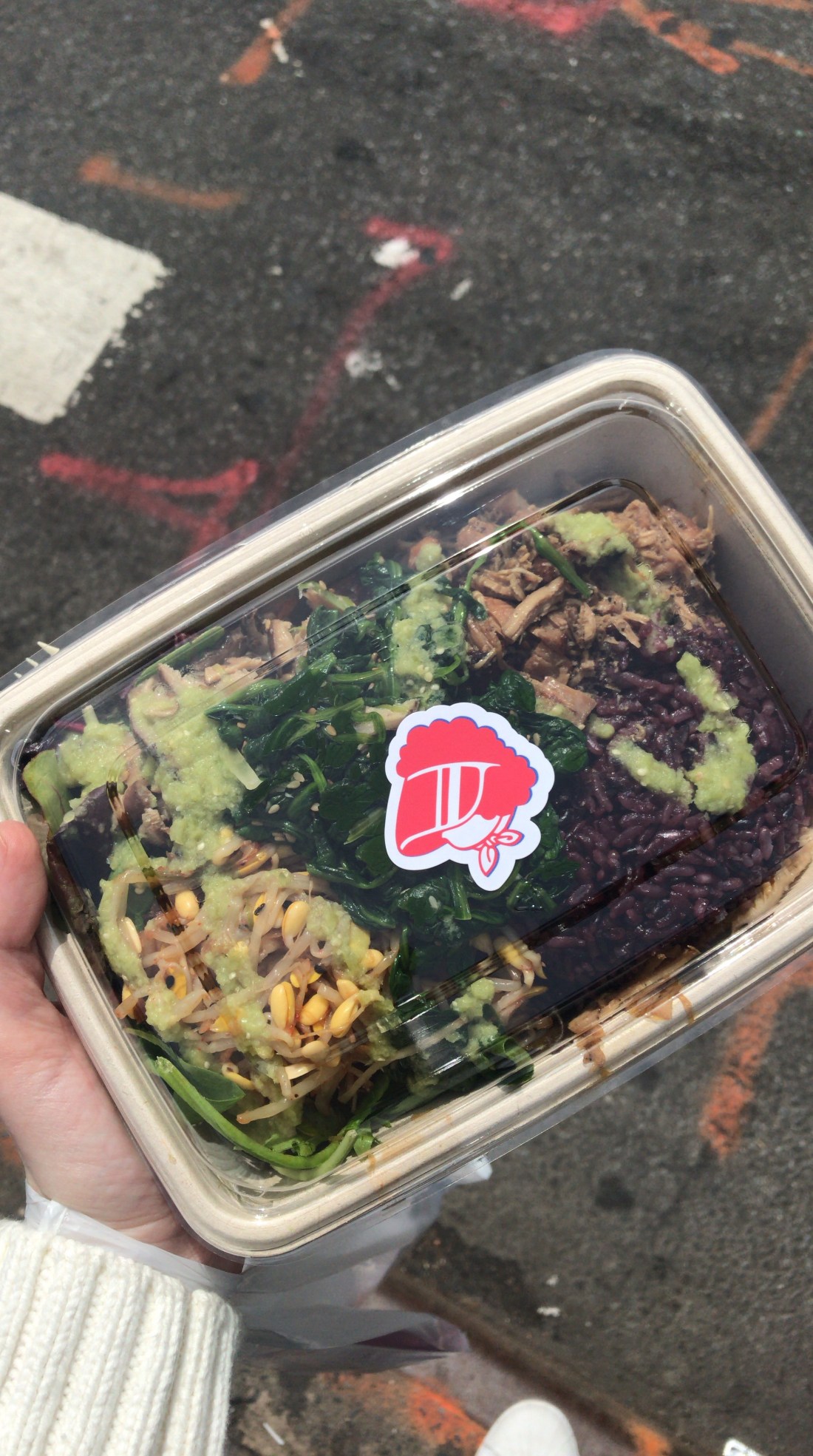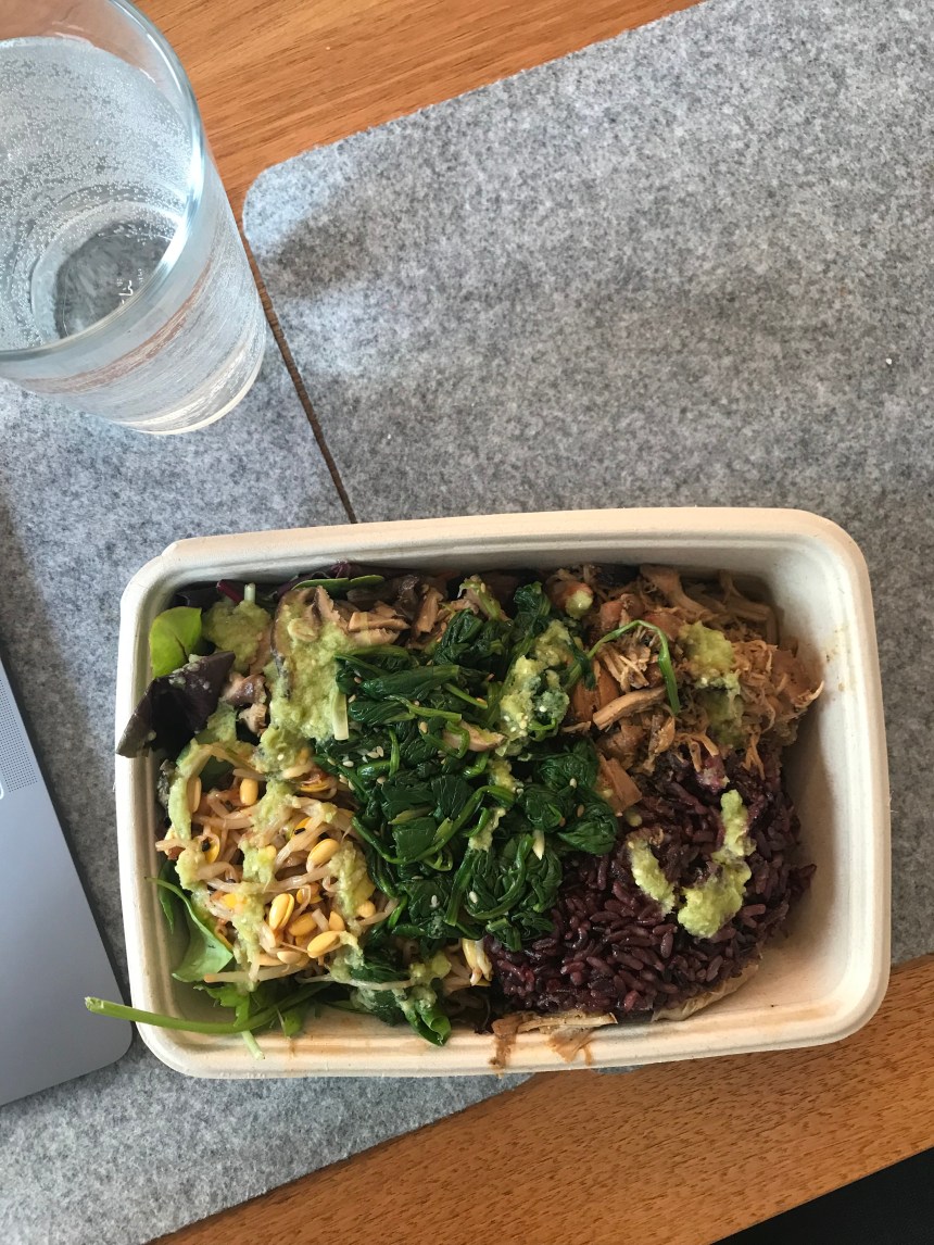 I went with a rice bowl (which still comes with some lettuce so it’s kinda the best of both worlds). For my rice base I got the purple rice because 1) it’s a hit heartier and 2) it’s pretty. Chicken was my protein because it happened to look very nice – better than your standard build-a-bowl chicken. For veggies I got mushrooms, bean sprouts, and then (for an extra $2) added spinach. I went medium spicy for my sauce which definitely still packed some heat.
