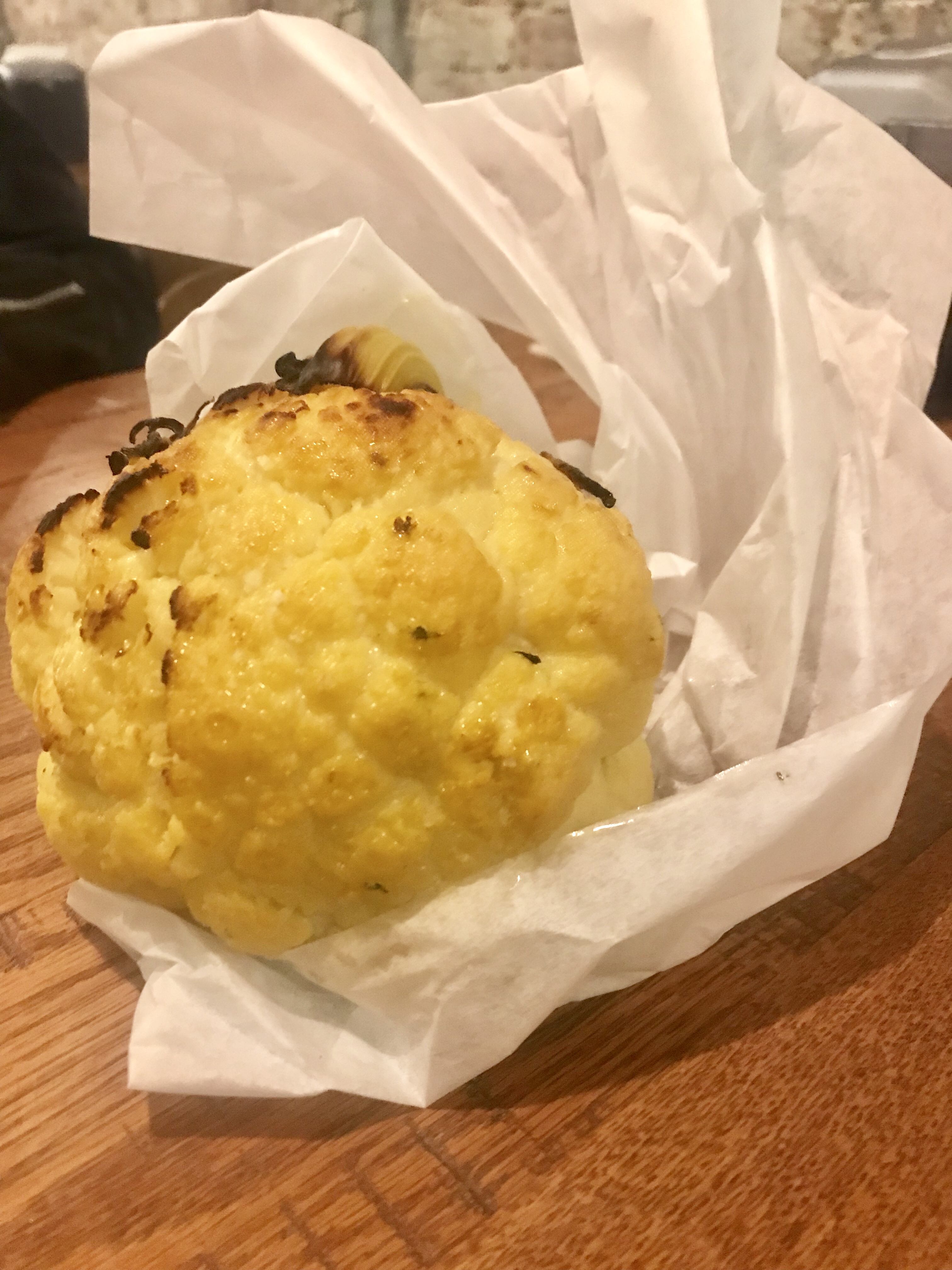 The first thing out of our mouths was “an order of the whole roasted baby cauliflower, obviously.” It’s famous. Based on their Insta story, it seems relatively simple to make. It’s boiled then roasted. It’s barely seasoned. And yet…it’s perfect. It’s plopped on your table in some parchment paper and it’s so soft that you can just attack it with your fork – no knife needed. It’s so simple but so great. I know some people hat cauliflower, but if you like it at all, this is $9.50 you should spend.