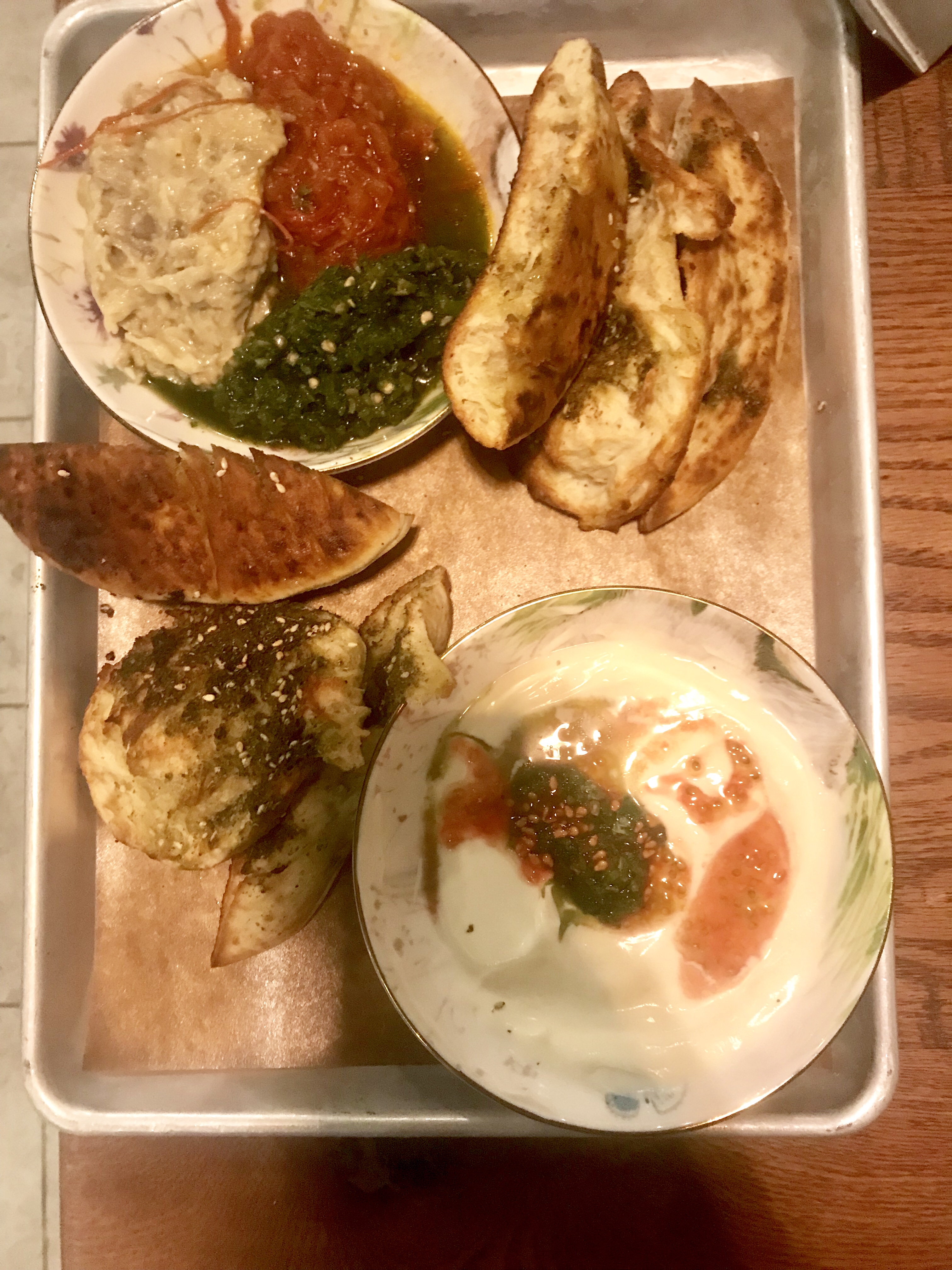 Appetizer number two was the “mezze to begin with” (za’atar pita served with 3 spicy sauces & Ronnybroook’s sour cream/tahini). Sour cream + tahini is a genius combo and we both wondered why we hadn’t thought of it. Also, za’atar should probably be dusted on all pita moving forward. If you’re someone who likes to order hummus as a start to a standard meal, you’ll enjoy this.