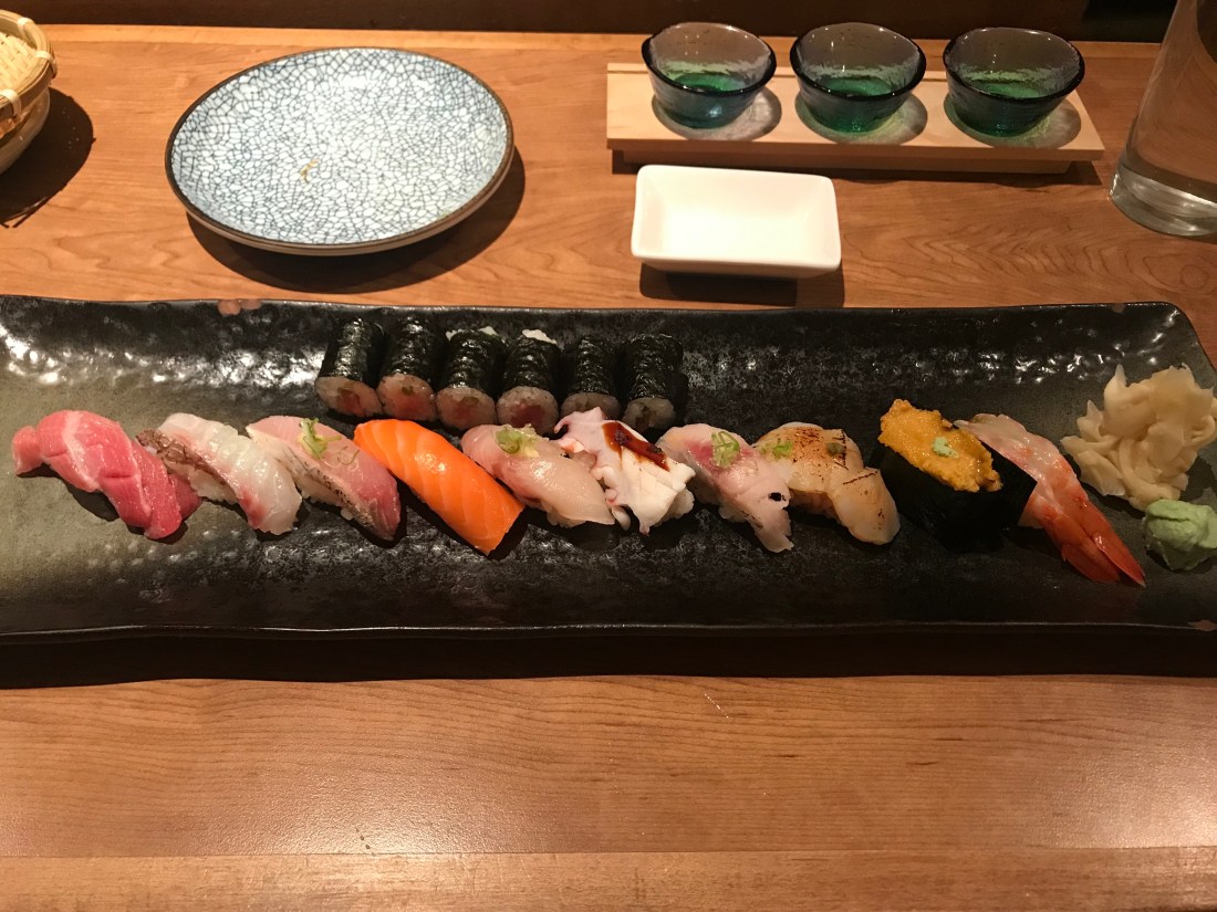 For our mains, I went with the sushi set and Albert got a couple of rolls. That’s the good thing about this place – there is plenty of “easy” sushi on this menu for the less adventurous eaters. That said, I still got to get my omakase. The sushi set comes with 10 pieces and a roll for $50. I later added two more pieces (roe and seared toro), which brought my total to $75, the same price as the full omakase for essentially the same meal. Don’t be fooled by the fact that the sushi set seems basic. It’s still chef’s choice and comes with some amazing pieces of ngiri, like sweet shrimp and uni.