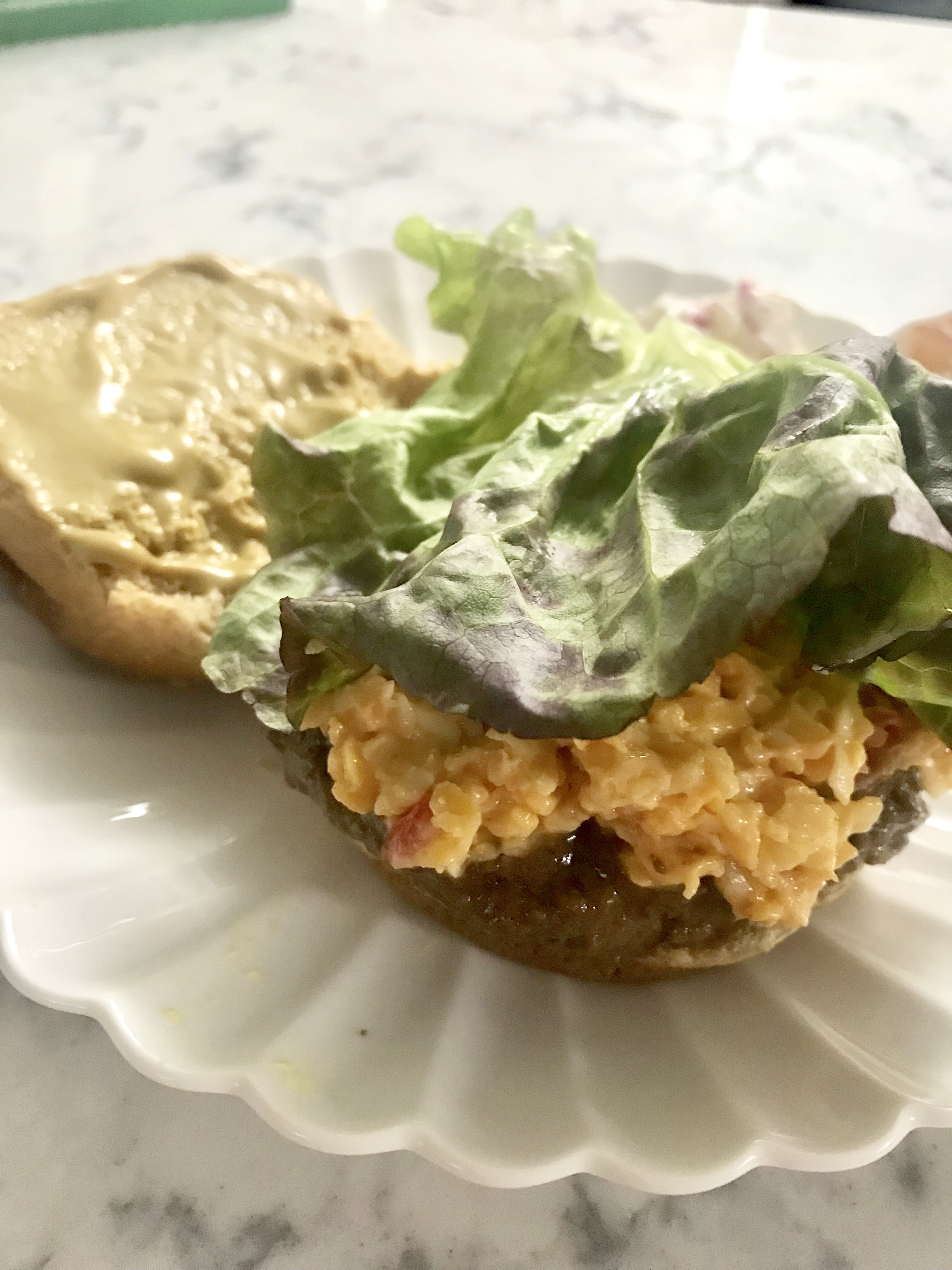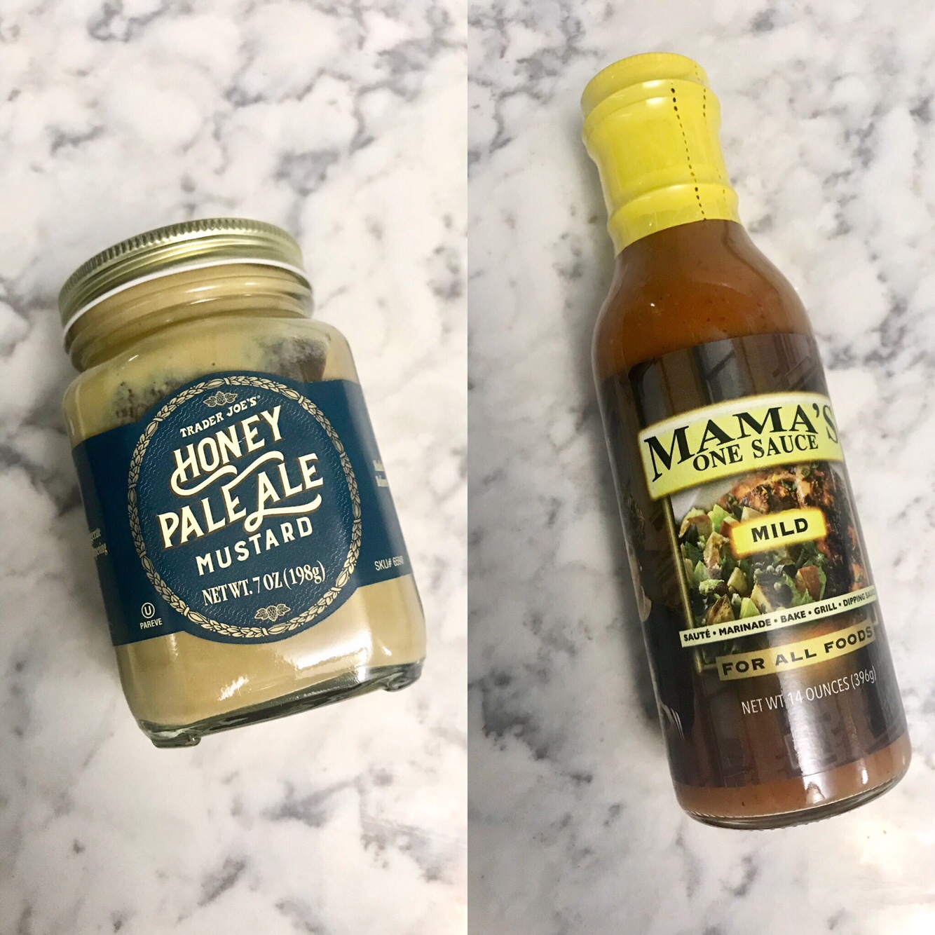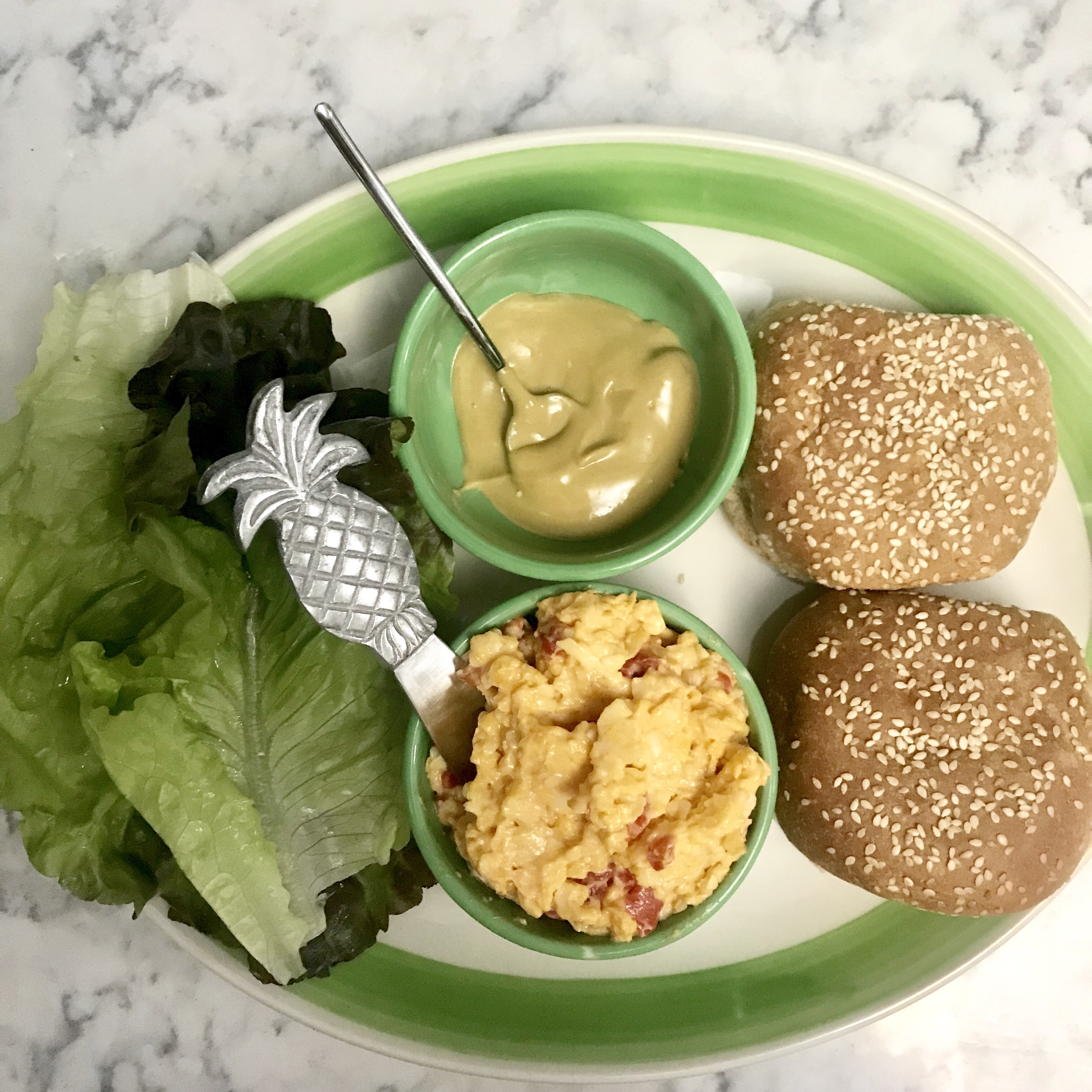 First, brush some of the Mama’s One Sauce onto each of the burger patties and grill away. (Note: our plan was to grill but after showering post-gym, my beau no longer wanted to get smoke all up in his clean self. Instead, I cooked them up in a cast iron and they still came out great. Not as pretty, but great.) Now for the toppings. Three things went on these burgers: pimento cheese, Trader Joe’s new honey ale mustard (spread on the buns), and lettuce. Tomato would be good, but I forgot to buy it and, frankly, I don’t care all that much about tomatoes.