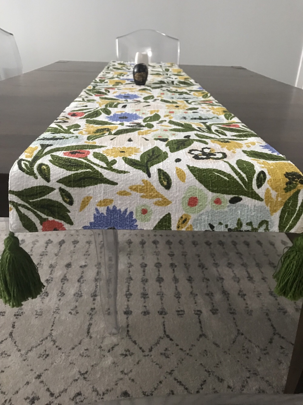 I’ve started buying decor for the apartment again. Just a little thing here and there. Slowly but surely the place is really coming together. My latest find is this table runner that I snagged for $18. I love how it picks up the green we’ve been using throughout that room.