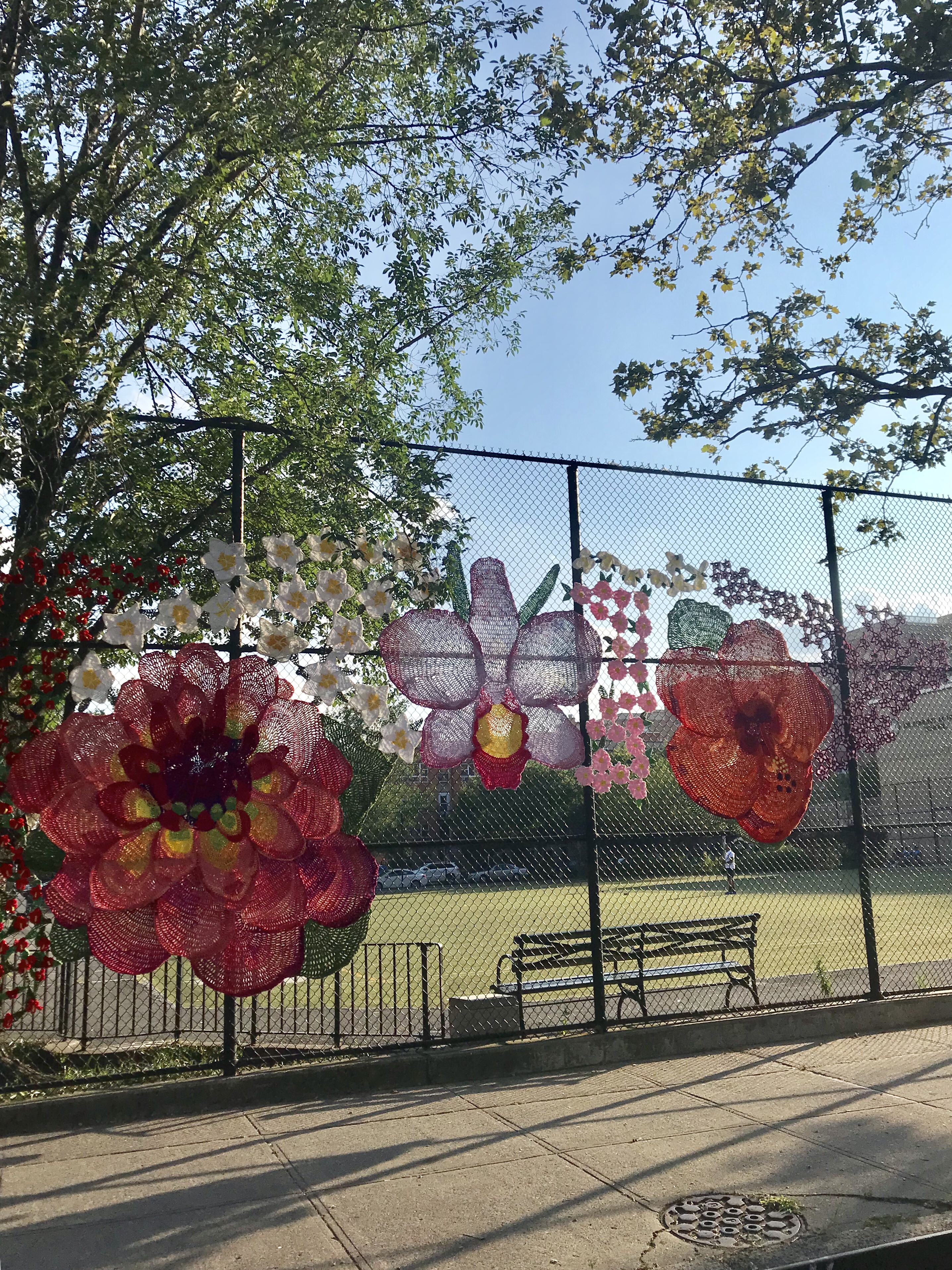 There’s currently an art installation on a chain link fence in our neighborhood. The knitted floral scene is impressive and softens up an area that feels very concrete jungle-ish.