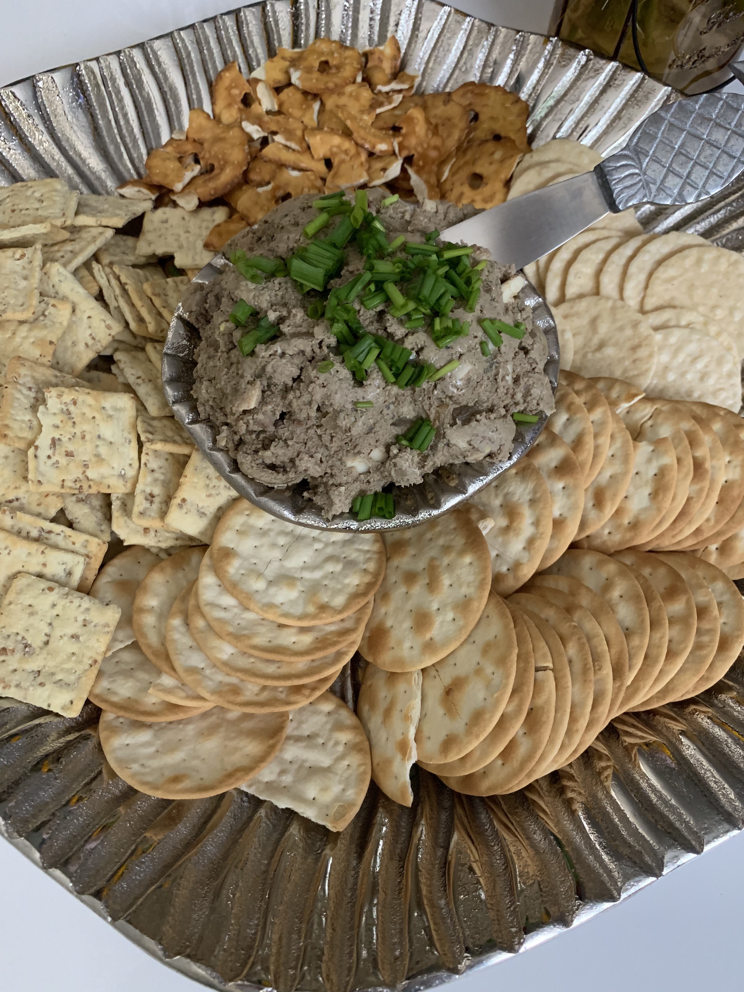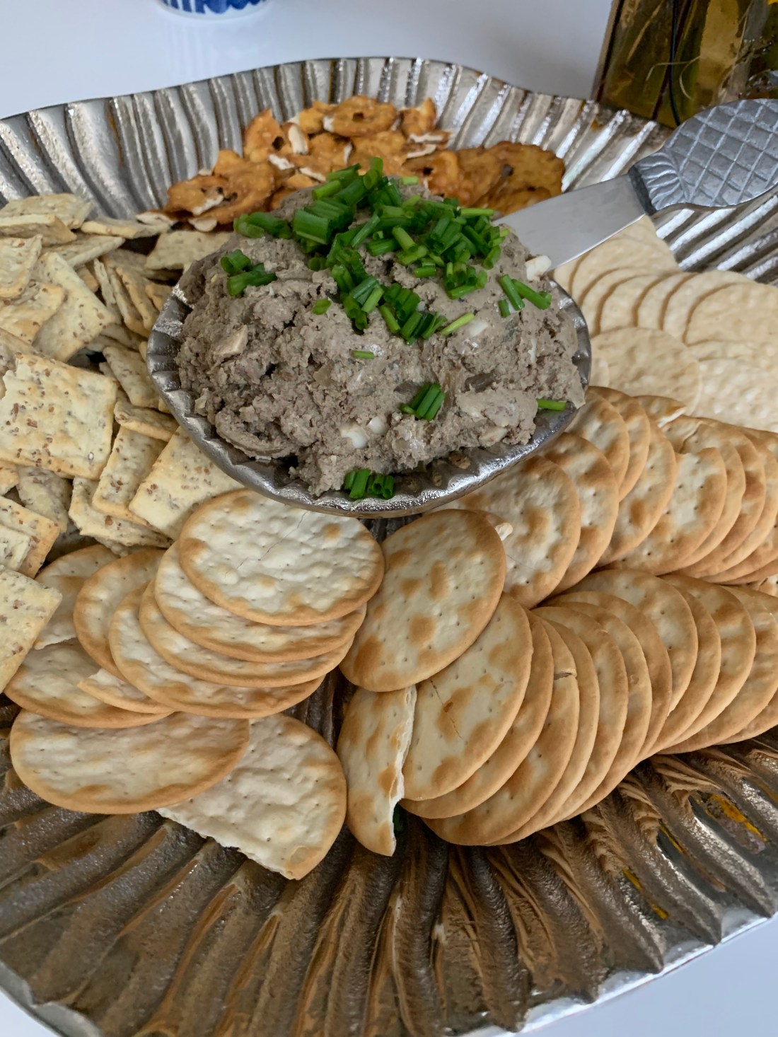 Start by hard boiling 2 eggs. While they’re going, sauté chicken livers in Crisco (or lard or whatever fat you like). We didn’t have a huge group (8 adults) so 3/4 lb makes for a nice little appetizer. When the livers are cooked through (i.e., just barely pink inside), remove them from the pan and use that very same pan to sauté one onion. Deglaze all those yummy chicken liver bits with some white wine and let it go til the wine is cooked off and the onions are soft and full of flavor. Chop up the livers, onions, eggs, and salt/pepper and get em goin in a food processor or bowl + immersion blender til it reaches the consistency you like. Put this pâté (because it sounds fancier that way) in a lovely bowl and top with chives. Serve with your fave crackers.